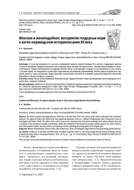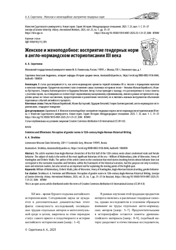 В статье рассматривается то, как англо-нормандские хронисты первой половины XII в. писали о порицаемом мужском и женском поведении. Предметом изучения стали сочинения самых значимых историков эпохи – Уильяма Мальмсберийского, Иоанна Вустерского, Генриха Хантингдонского и Ордерика Виталия. Автор статьи приходит к выводу, что рассмотренные в статье сюжеты с участием героев, чье поведение не соответствует нормативному маскулинному и фемининному, имели в рамках исторического нарратива целью не только наставление, предостережение и развлечение читателей, но и являлись важным инструментом объяснения переломных событий английского прошлого.