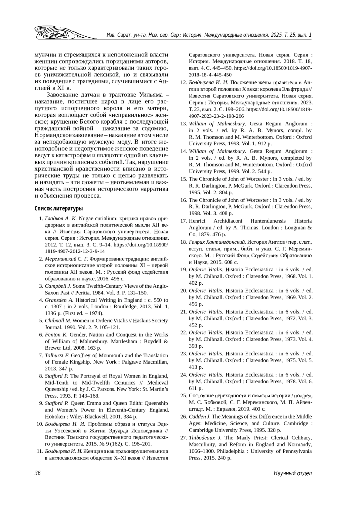 11. 	Болдырева И. И. Женщина как правонарушительница в англосаксонском обществе X-XI веков // Известия Саратовского университета. Новая серия. Серия: История. Международные отношения. 2018. Т. 18, вып. 4. С. 445-450. DOI: 10.18500/1819-4907-2018-18-4-445-450 EDN: ZAABZZ