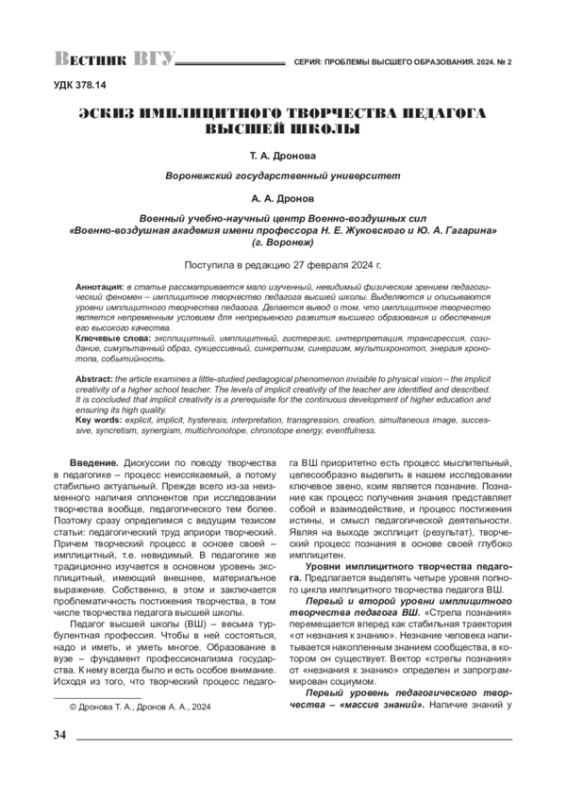 Дискуссии по поводу творчества в педагогике – процесс неиссякаемый, а потому стабильно актуальный. Прежде всего из-за неизменного наличия оппонентов при исследовании творчества вообще, педагогического тем более. Поэтому сразу определимся с ведущим тезисом статьи: педагогический труд априори творческий. Причем творческий процесс в основе своей – имплицитный, т. е. невидимый. В педагогике же традиционно изучается в основном уровень эксплицитный, имеющий внешнее, материальное выражение. Собственно, в этом и заключается проблематичность постижения творчества, в том числе творчества педагога высшей школы.