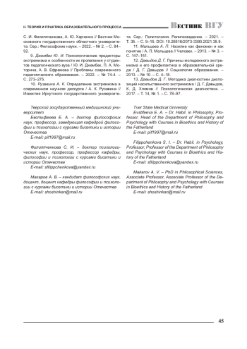 9. 	Джембек Ю. И. Психологические предикторы экстремизма и особенности их проявления у студентов педагогического вуза / Ю. И. Джембек, П. А. Моторина, А. В. Ефремова // Проблемы современного педагогического образования. - 2022. - № 74-4. - С. 273-275. EDN: BRQFLX
