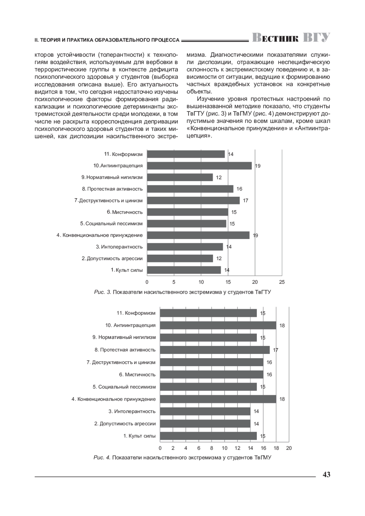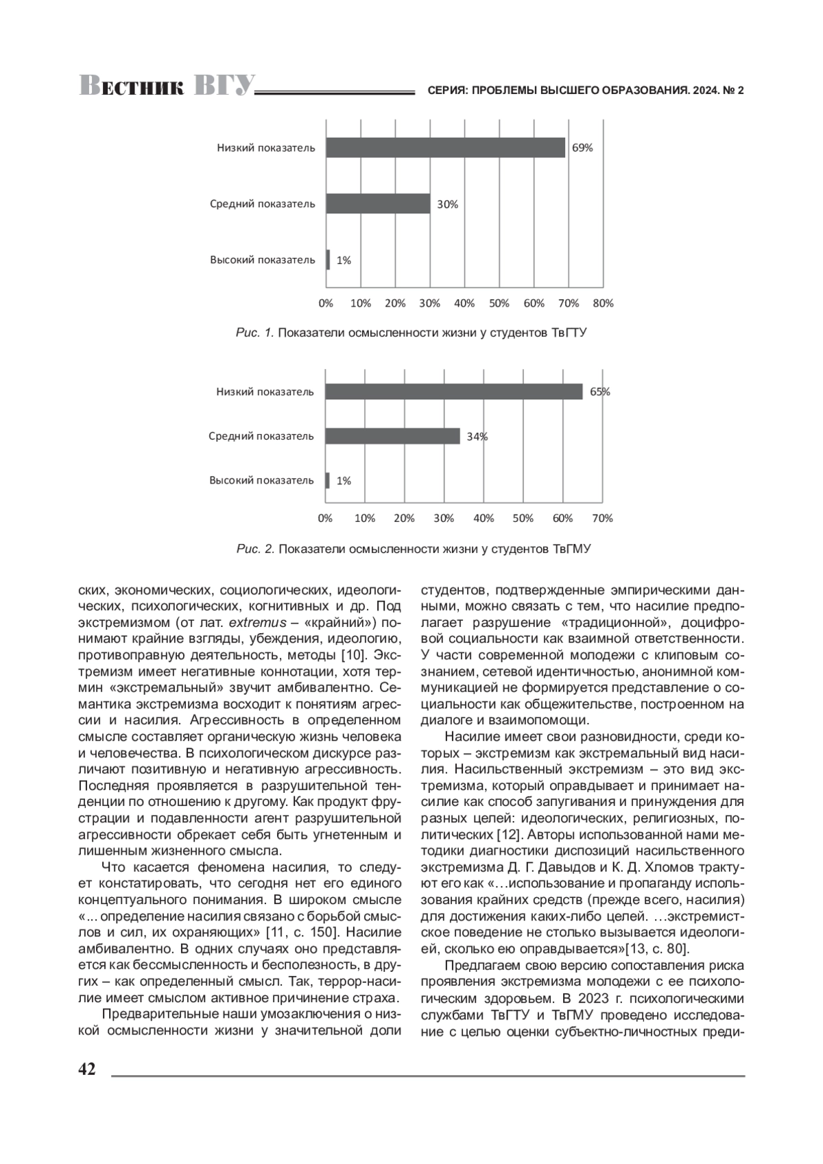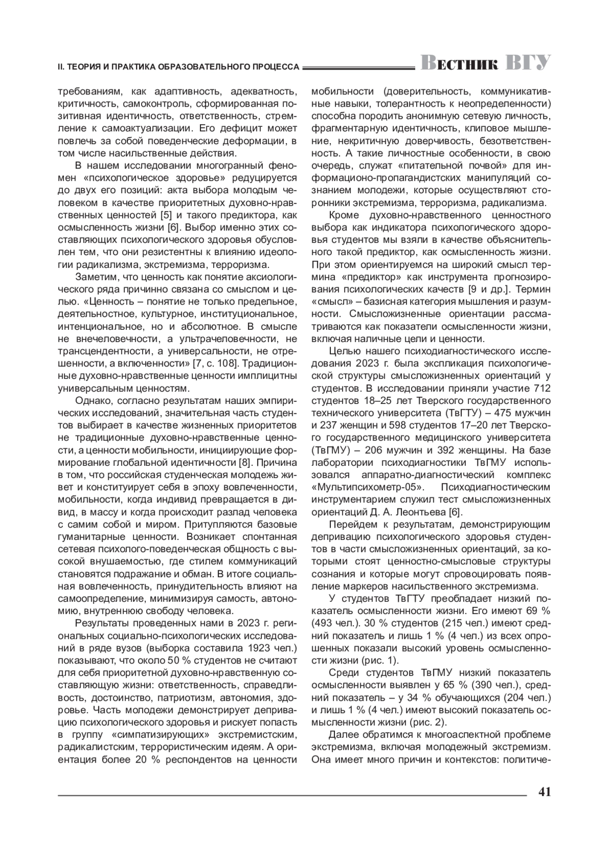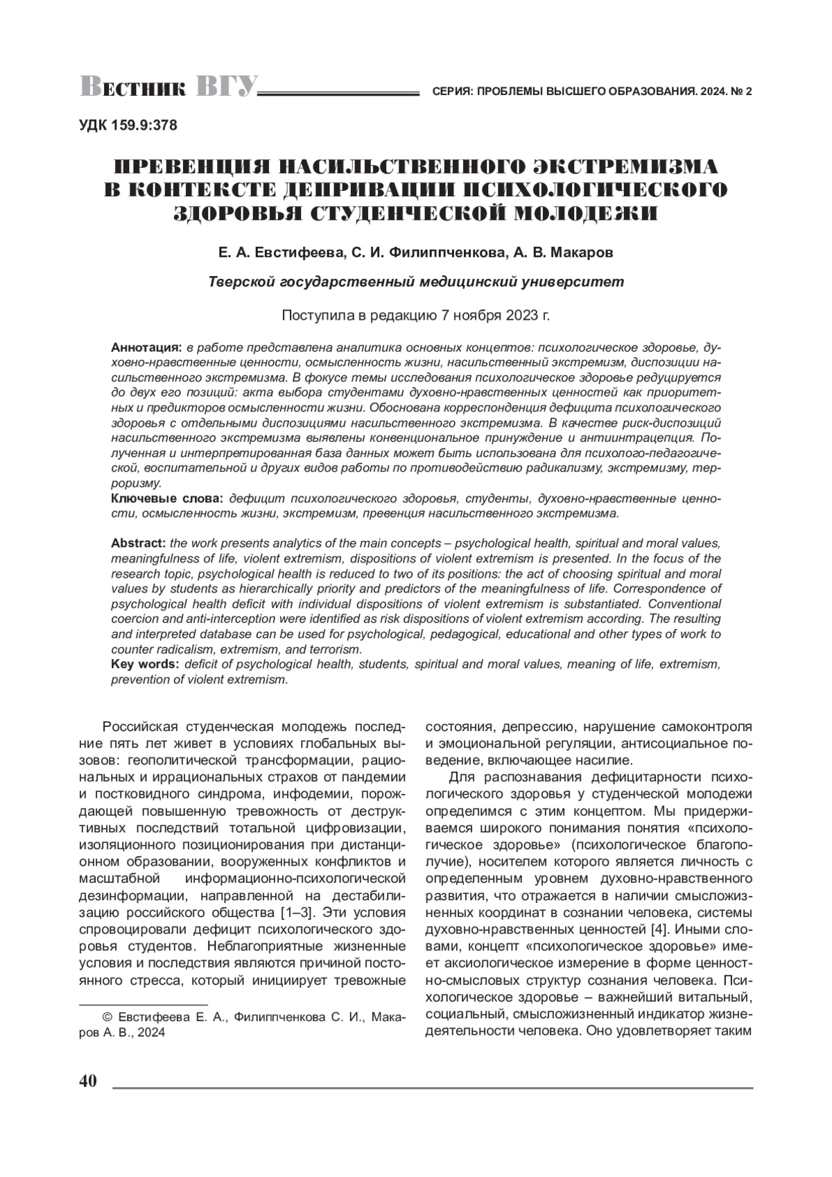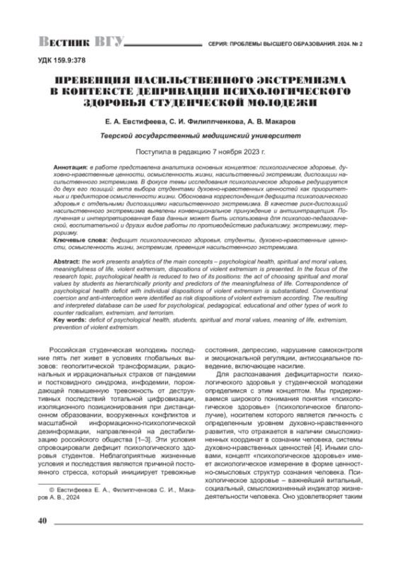 В работе представлена аналитика основных концептов: психологическое здоровье, духовно-нравственные ценности, осмысленность жизни, насильственный экстремизм, диспозиции насильственного экстремизма. В фокусе темы исследования психологическое здоровье редуцируется до двух его позиций: акта выбора студентами духовно-нравственных ценностей как приоритетных и предикторов осмысленности жизни. Обоснована корреспонденция дефицита психологического здоровья с отдельными диспозициями насильственного экстремизма. В качестве риск-диспозиций насильственного экстремизма выявлены конвенциональное принуждение и антиинтрацепция. Полученная и интерпретированная база данных может быть использована для психолого-педагогической, воспитательной и других видов работы по противодействию радикализму, экстремизму, терроризму.