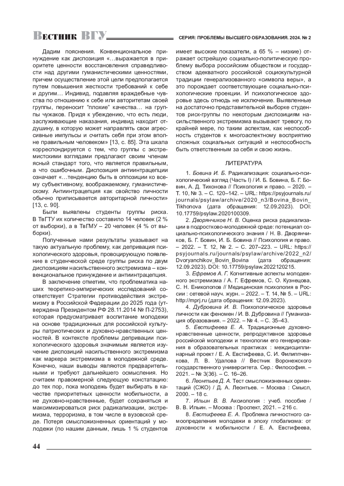 2. 	Дворянчиков Н. В. Оценка риска радикализации в подростково-молодежной среде: потенциал социально-психологического знания / Н. В. Дворянчиков, Б. Г. Бовин, И. Б. Бовина // Психология и право. - 2022. - Т. 12, № 2. - С. 207-223. - URL: https://psyjournals.ru/journals/psylaw/archive/2022_n2/Dvoryanchikov_Bovin_Bovina (дата обращения: 12.09.2023). DOI: 10.17759/psylaw.2022120215 EDN: PQBDXQ