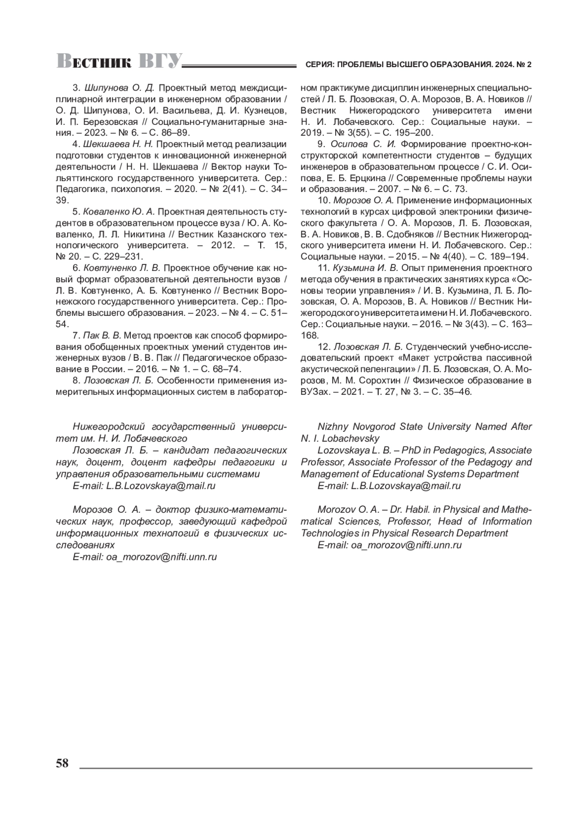 3. Шипунова О. Д. Проектный метод междисциплинарной интеграции в инженерном образовании / О. Д. Шипунова, О. И. Васильева, Д. И. Кузнецов, И. П. Березовская // Социально-гуманитарные знания. - 2023. - № 6. - С. 86-89. EDN: MKZFLR