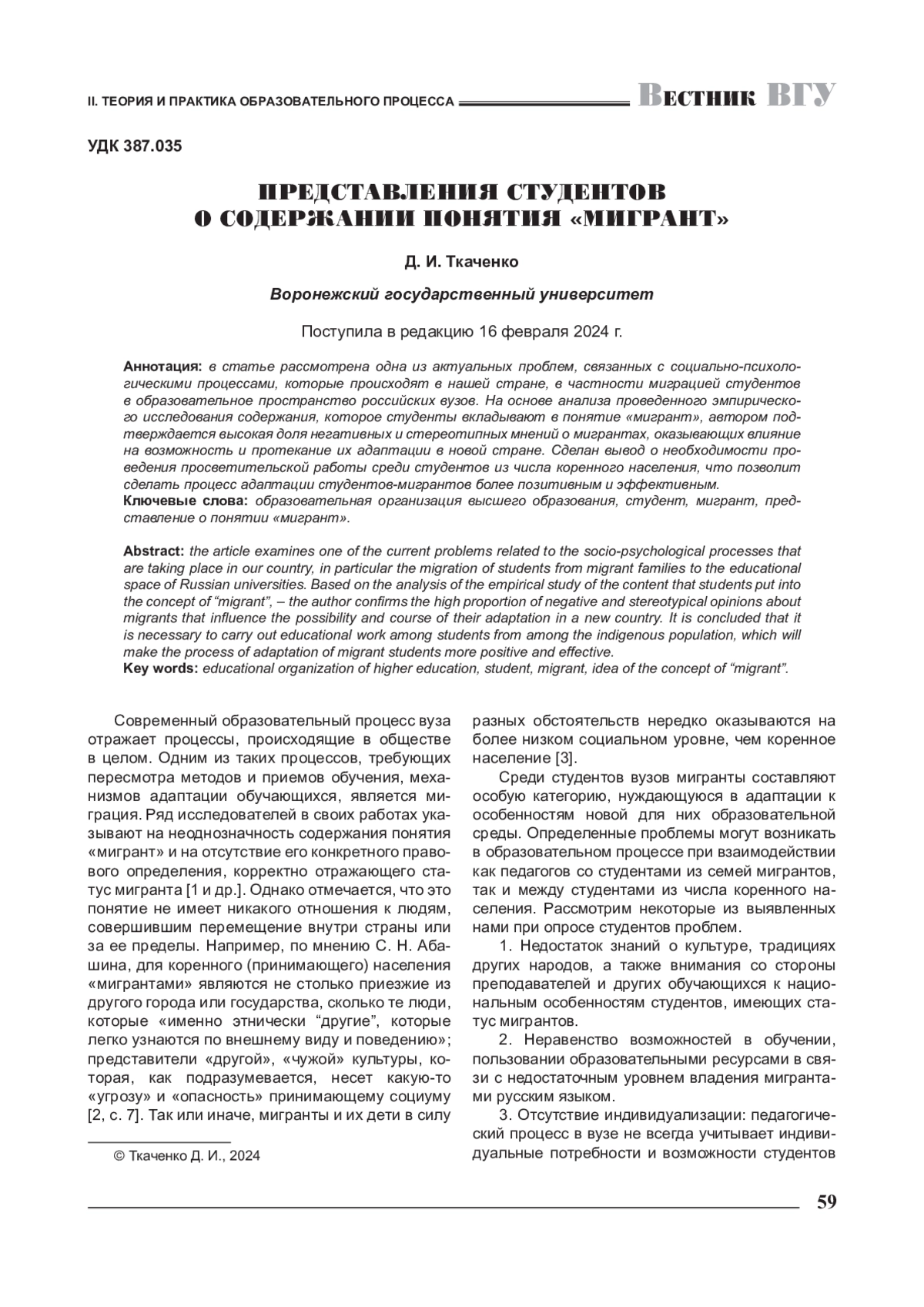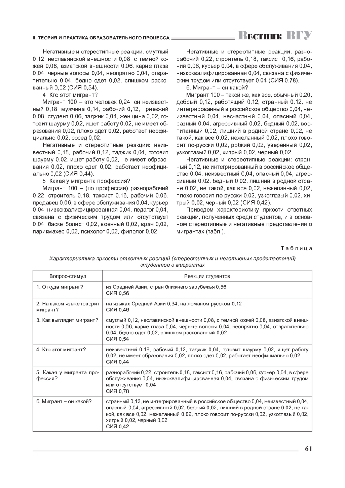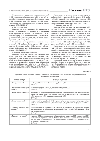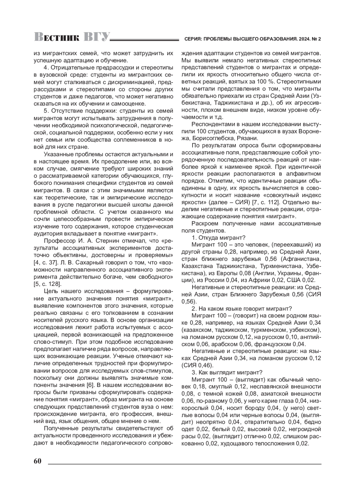 Современный образовательный процесс вуза отражает процессы, происходящие в обществе в целом. Одним из таких процессов, требующих пересмотра методов и приемов обучения, механизмов адаптации обучающихся, является миграция. Ряд исследователей в своих работах указывают на неоднозначность содержания понятия «мигрант» и на отсутствие его конкретного правового определения, корректно отражающего статус мигранта [1 и др.]. Однако отмечается, что это понятие не имеет никакого отношения к людям, совершившим перемещение внутри страны или за ее пределы. Например, по мнению С. Н. Абашина, для коренного (принимающего) населения «мигрантами» являются не столько приезжие из другого города или государства, сколько те люди, которые «именно этнически “другие”, которые легко узнаются по внешнему виду и поведению»; представители «другой», «чужой» культуры, которая, как подразумевается, несет какую-то «угрозу» и «опасность» принимающему социуму [2, с. 7].