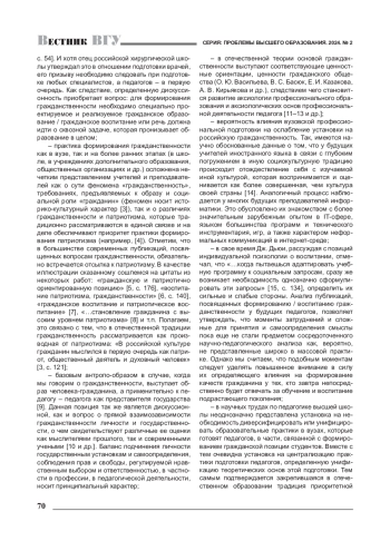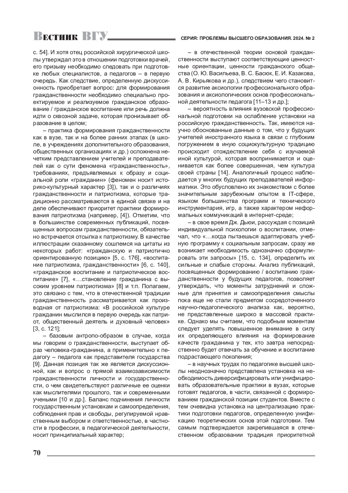 11. 	Васильева О. Ю. Традиционные ценности современного российского педагогического образования / О. Ю. Васильева, В. С. Басюк, Е. И. Казакова // Вестник Московского университета. Сер. 20, Педагогическое образование. - 2022. - № 4. - С. 4-17. EDN: OXZCSZ