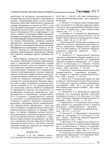 13. 	Крупченко А. К. Ценностные ориентации как основа становления аксиологического профиля гражданской идентичности педагога / А. К. Крупченко, Х.-А. С. Халадов, Т. Ю. Медведева, Г. А. Папуткова, И. В. Головина // Вестник Мининского университета. - 2023. - Т. 11, № 3. - URL: https://www.minin-vestnik.ru/jour/article/view/1522 (дата обращения: 08.10.2023). EDN: XTMVQI
