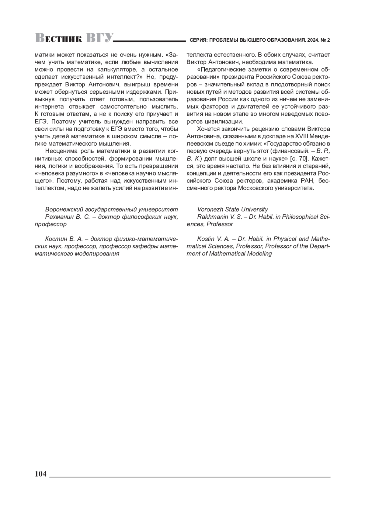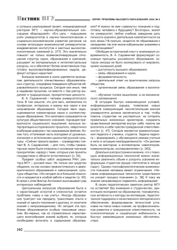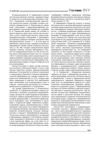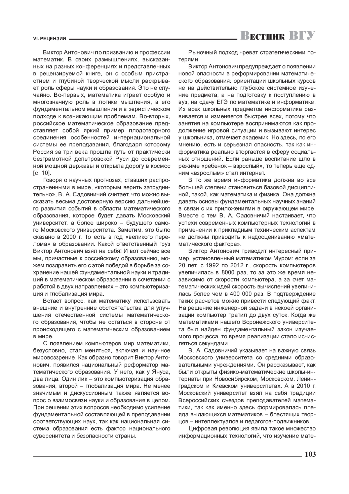 В. А. Садовничий – человек университетского типа. В том смысле, что для него, математика по профессии, интересны и важны все науки и все направления образования. Сегодня явно недооцениваются гуманитарные науки и соответствующее образование. Это негативно сказывается на культуре общественного сознания, порождая превратности социального мышления, вольные интерпретации исторического прошлого, невротично возбуждая доверие к так называемым фейкам, более того, отталкивая часть молодежи от духовных, этических и эстетических ценностей русской культуры. «Сейчас пришло время, – справедливо считает В. А. Садовничий, – для того, чтобы гуманитарные науки были отнесены к основным научным приоритетам, наряду с теми, которые уже приняты государством в области естественных» [с. 54].