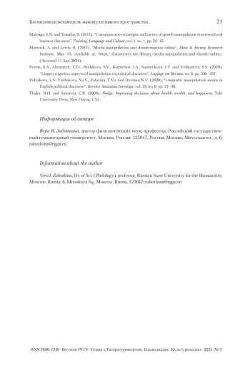 5. Заботкина, Позднякова 2024 - Заботкина В.И., Позднякова Е.М. Когнитивно-коммуникативная динамика манипулирования в медиа // Вопросы когнитивной лингвистики. 2024. № 4. С. 124-134.