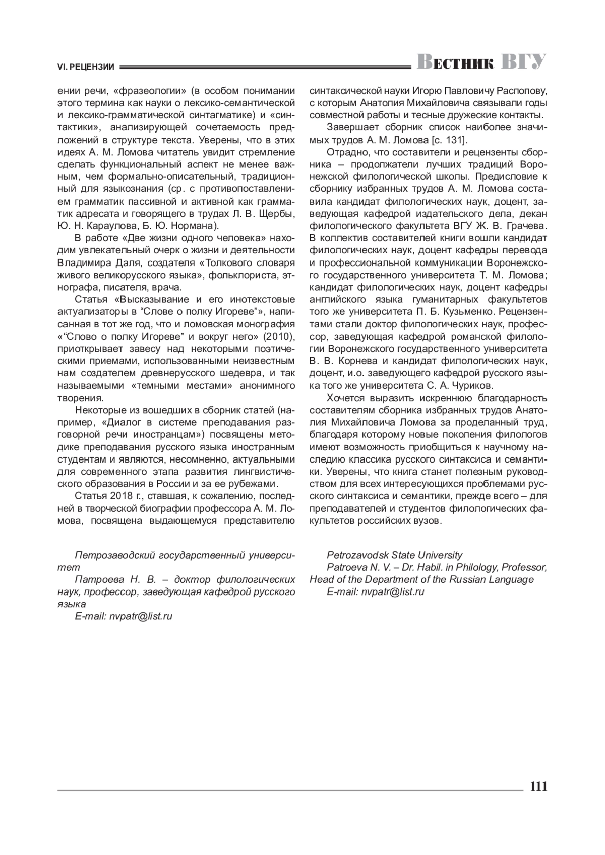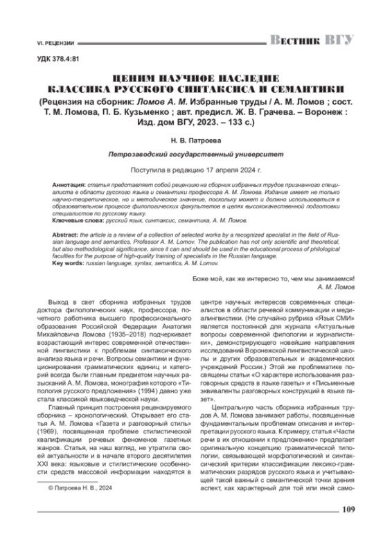 Выход в свет сборника избранных трудов доктора филологических наук, профессора, почетного работника высшего профессионального образования Российской Федерации Анатолия Михайловича Ломова (1935–2018) подчеркивает возрастающий интерес современной отечественной лингвистики к проблемам синтаксического анализа языка и речи. Вопросы семантики и функционирования грамматических единиц и категорий всегда были главным предметом научных разысканий А. М. Ломова, монография которого «Типология русского предложения» (1994) давно уже стала классикой языковедческой науки.