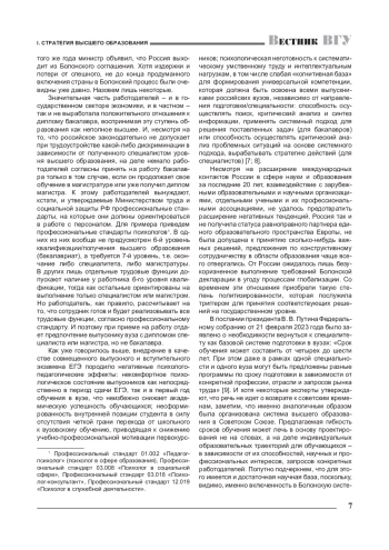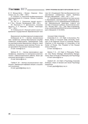 30. 	Ендовицкий Д. А. Высшая школа в русле современной государственной образовательной политики / Д. А. Ендовицкий // Вестник Воронежского государственного университета. Серия: Проблемы высшего образования. - 2023. - № 3. - 5-9. EDN: RBXVSG