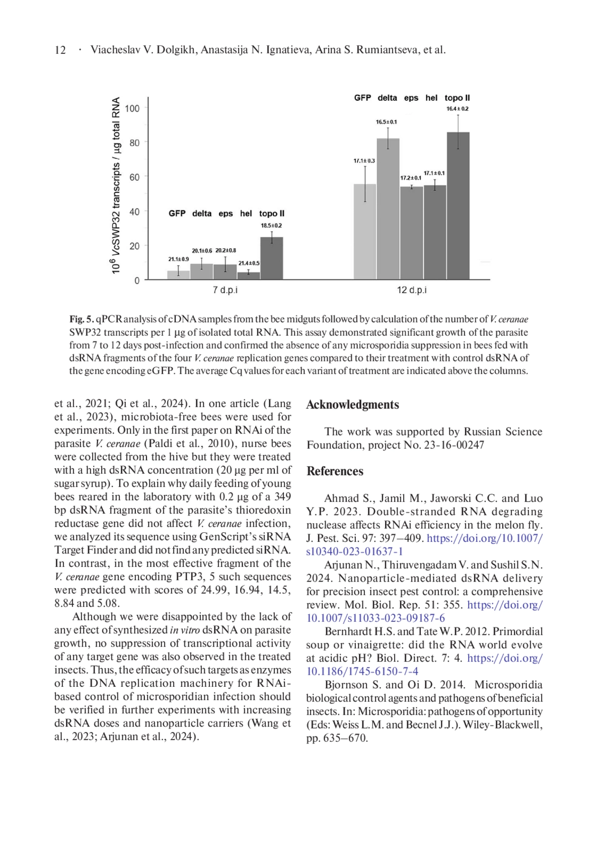 7. Fadeev R.R., Kudryavtseva Yu.S., Bayazyt K-D.K., Shuhalova A.G. and Dolgikh V.V. 2024. The optimized method to isolate dsRNA synthesized in Escherichia coli HT115(DE3). Agricultural Biology. 59: 460-472. DOI: 10.15389/agrobiology.2024.3.460eng