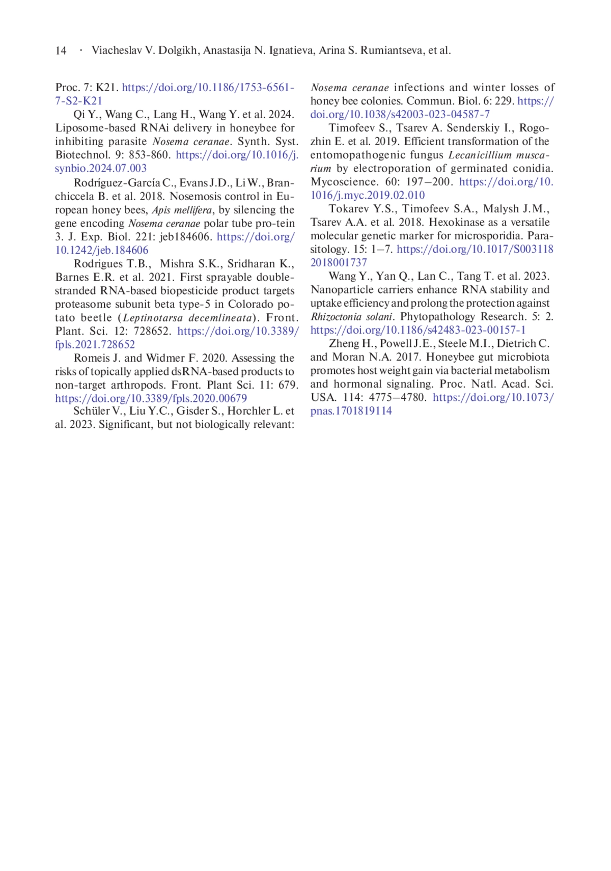 28. Romeis J. and Widmer F. 2020. Assessing the risks of topically applied dsRNA-based products to non-target arthropods. Front. Plant Sci. 11: 679. DOI: 10.3389/fpls.2020.00679