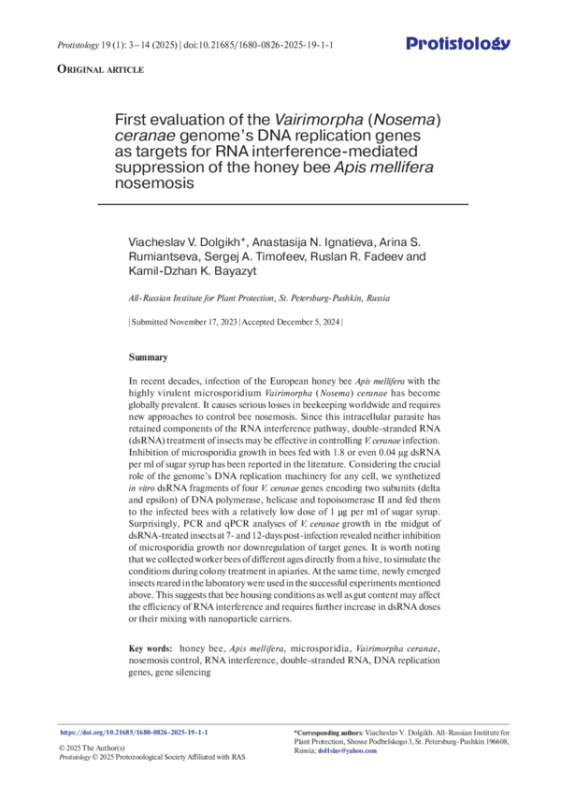 16. Ignatieva A.N., Timofeev S.A., Tokarev Y.S. and Dolgikh V.V. 2022. Laboratory cultivation of Vairimorpha (Nosema) ceranae (Microsporidia: Nosematidae) in artificially infected worker bees. Insects. 13: 1092. DOI: 10.3390/insects13121092