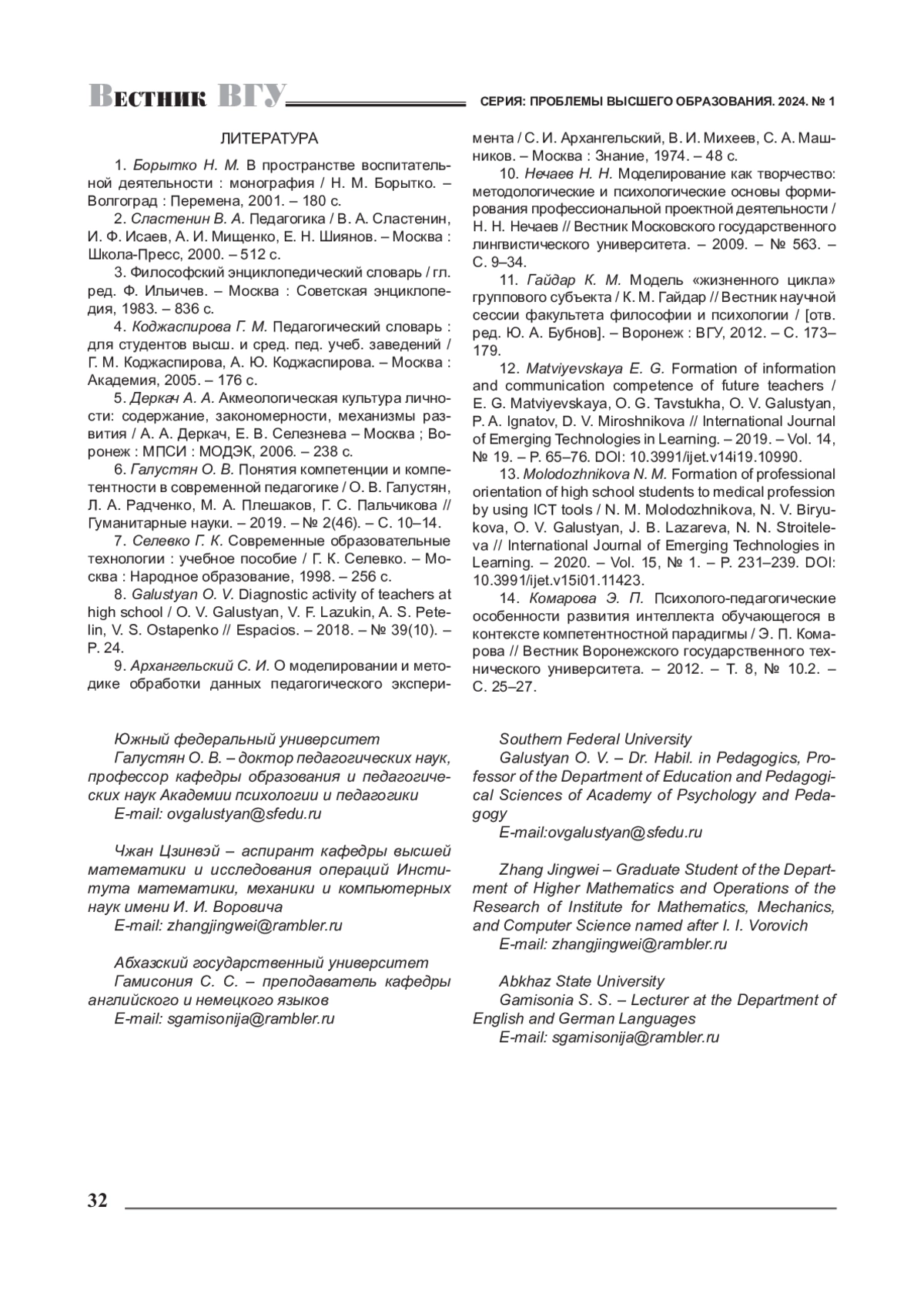 6. 	Галустян О. В. Понятия компетенции и компетентности в современной педагогике / О. В. Галустян, Л. А. Радченко, М. А. Плешаков, Г. С. Пальчикова // Гуманитарные науки. - 2019. - № 2(46). - С. 10-14.