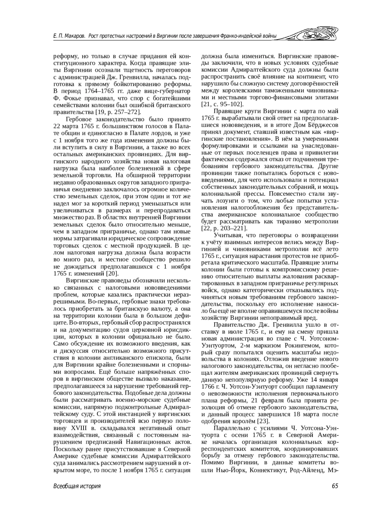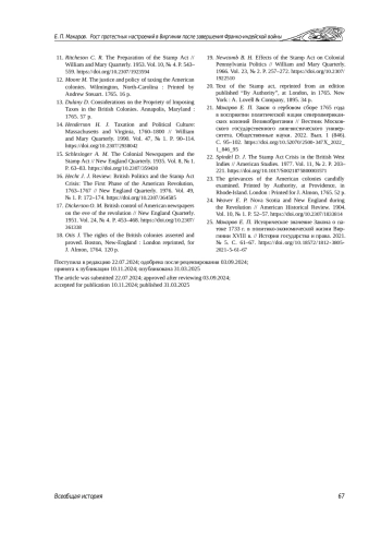 21. 	Макаров Е. П. Закон о гербовом сборе 1765 года в восприятии политической нации североамериканских колоний Великобритании // Вестник Московского государственного лингвистического университета. Общественные науки. 2022. Вып. 1 (846). С. 95-102. DOI: 10.52070/2500-347X_2022_1_846_95 EDN: PVWGQD