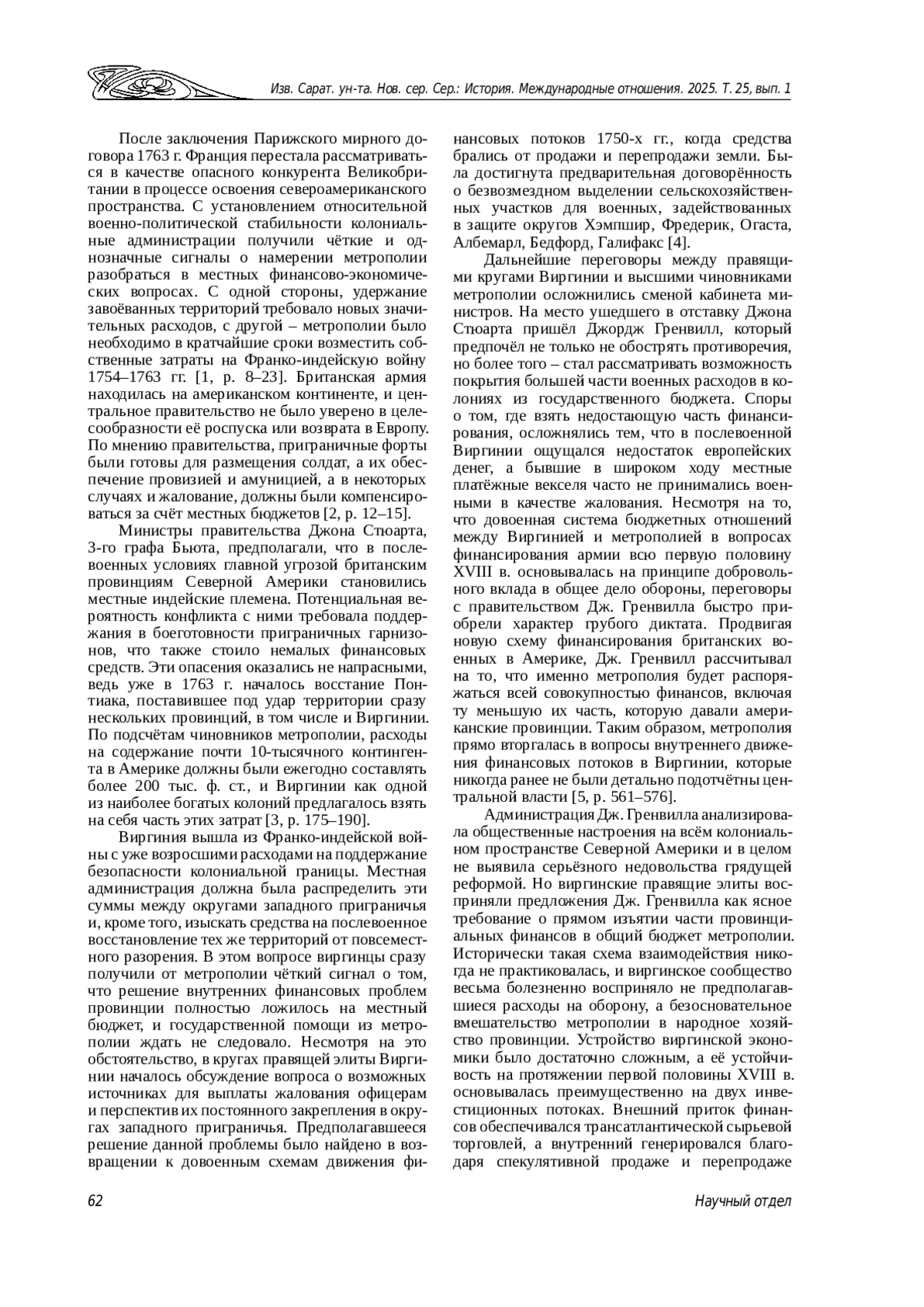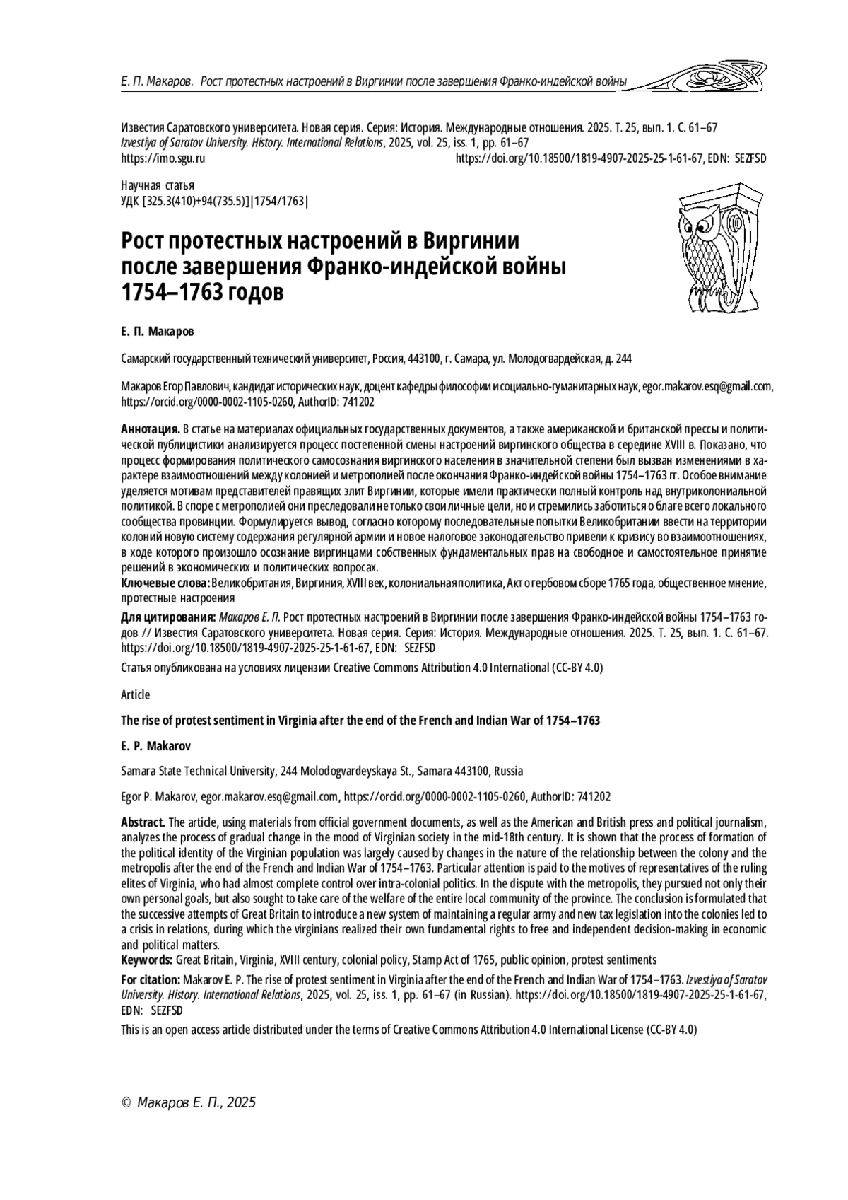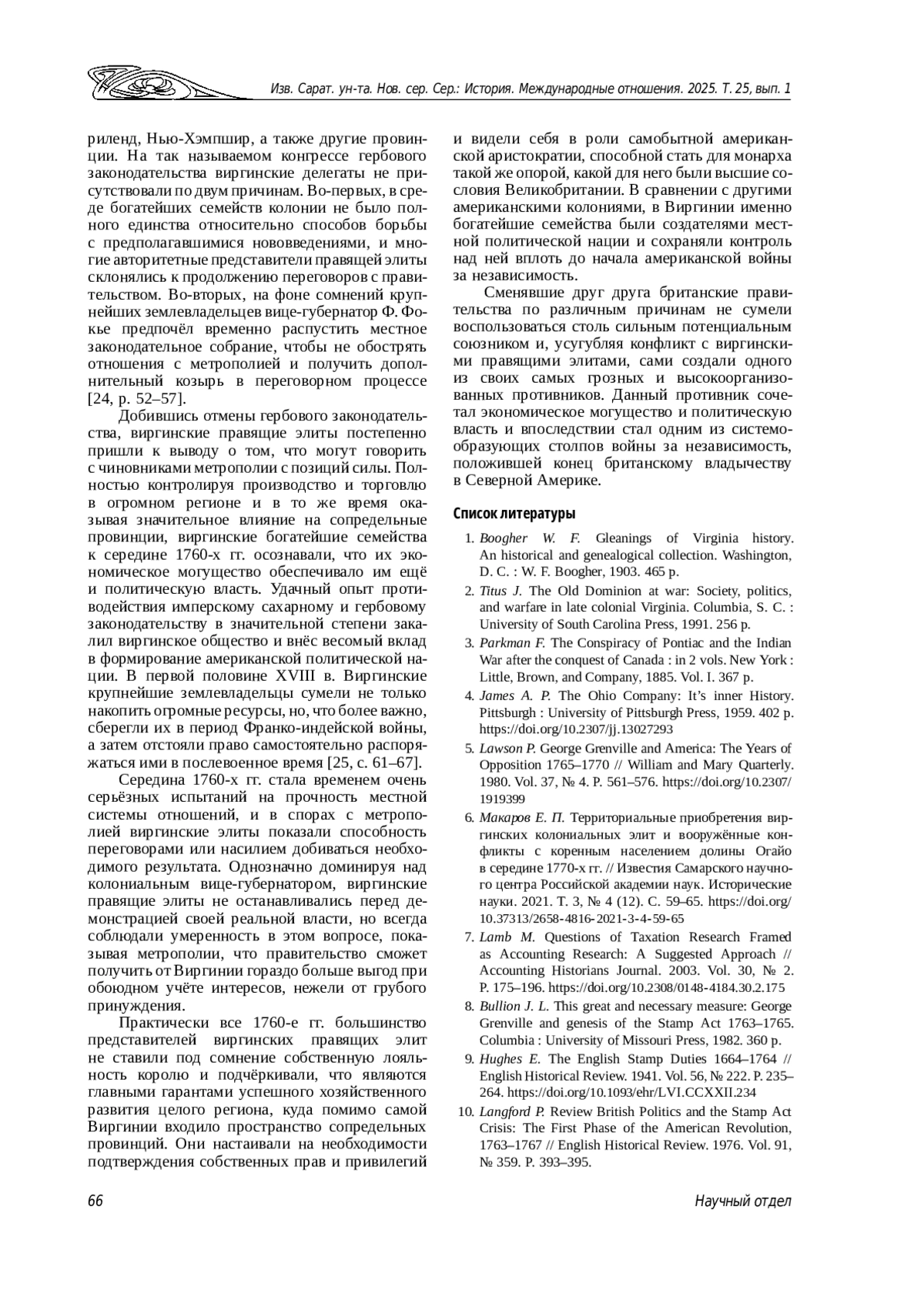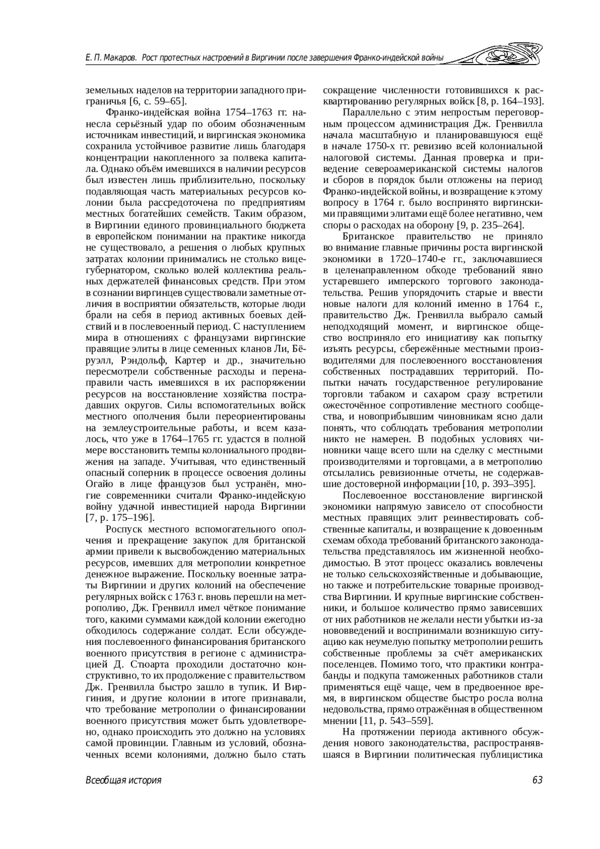 6. 	Макаров Е. П. Территориальные приобретения виргинских колониальных элит и вооружённые конфликты с коренным населением долины Огайо в середине 1770-х гг. // Известия Самарского научного центра Российской академии наук. Исторические науки. 2021. Т. 3, № 4 (12). С. 59-65. DOI: 10.37313/2658-4816-2021-3-4-59-65 EDN: ZSHCOY
