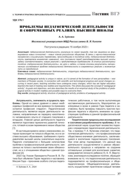 Педагогическая деятельность уникальна по своей природе, так как нацелена на формирование новых личностей - новых членов российского общества. В связи с научно-техническим прогрессом и социальными переменами, происходящими в последние годы, педагогическая деятельность претерпела множество изменений, что поставило перед преподавателями высшей школы задачу соответствовать новым реалиям и предъявляемым требованиям. В статье рассмотрены понятие «педагогическая деятельность», ее цели и задачи, а также описаны результаты эмпирического исследования проблем педагогической деятельности в современных реалиях и возможные пути их преодоления.