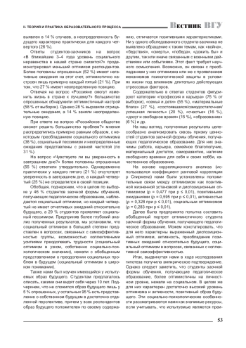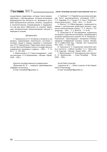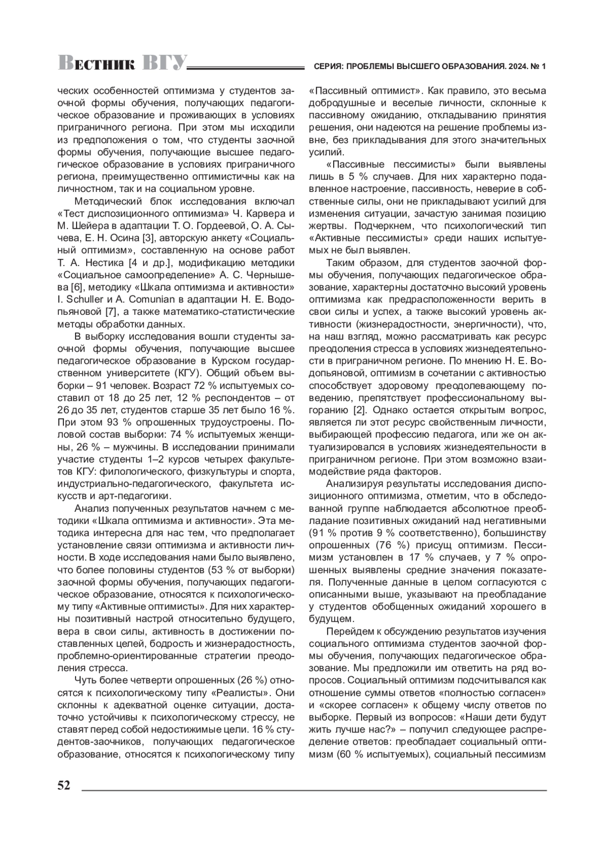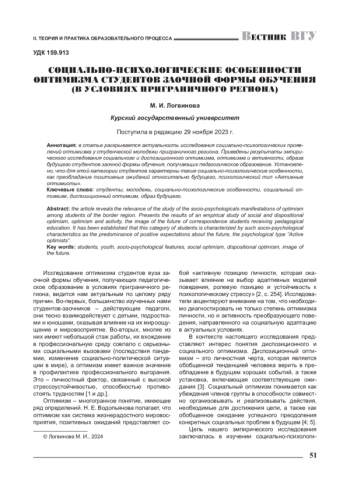 ной формы обучения, получающих педагогическое образование в условиях приграничного региона, видится нам актуальным по целому ряду причин. Во-первых, большинство изученных нами студентов-заочников – действующие педагоги, они тесно взаимодействуют с детьми, подростками и юношами, оказывая влияние на их мироощущение и мировосприятие. Во-вторых, многие из них имеют небольшой стаж работы, их вхождение в профессиональную среду совпало с серьезными социальными вызовами (последствия пандемии, изменение социально-политической ситуации в мире), а оптимизм имеет важное значение в профилактике профессионального выгорания. Это – личностный фактор, связанный с высокой стрессоустойчивостью, способностью противостоять трудностям [1 и др.].