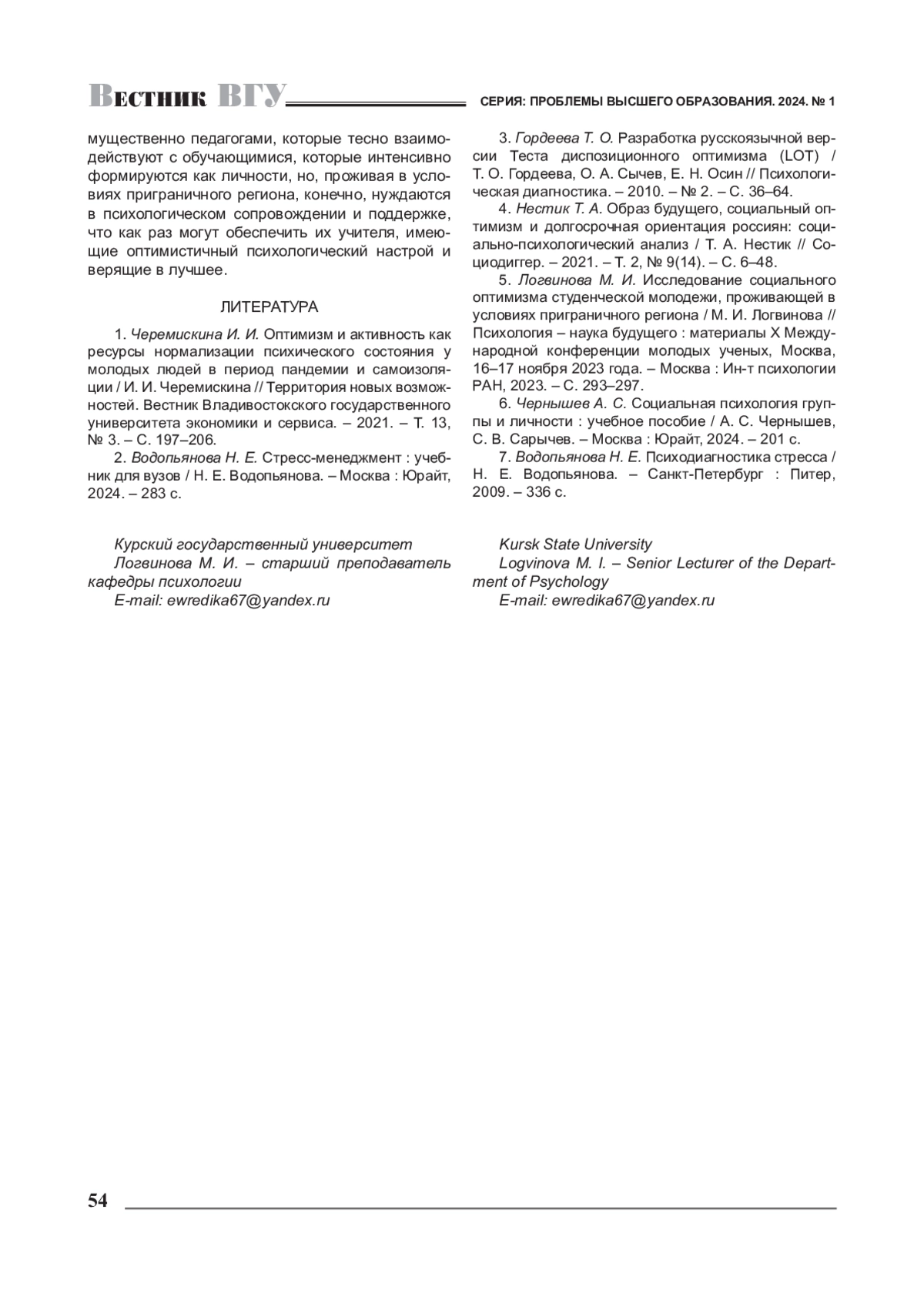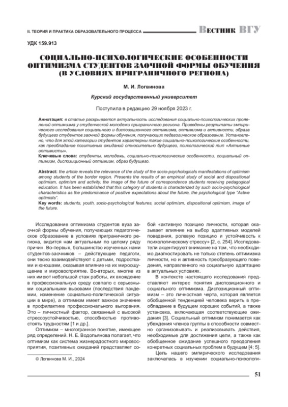 5. 	Логвинова М. И. Исследование социального оптимизма студенческой молодежи, проживающей в условиях приграничного региона / М. И. Логвинова // Психология - наука будущего: материалы X Международной конференции молодых ученых, Москва, 16-17 ноября 2023 года. - Москва: Ин-т психологии РАН, 2023. - С. 293-297. EDN: IRDNUF