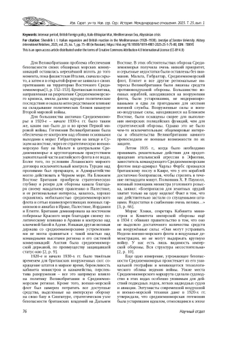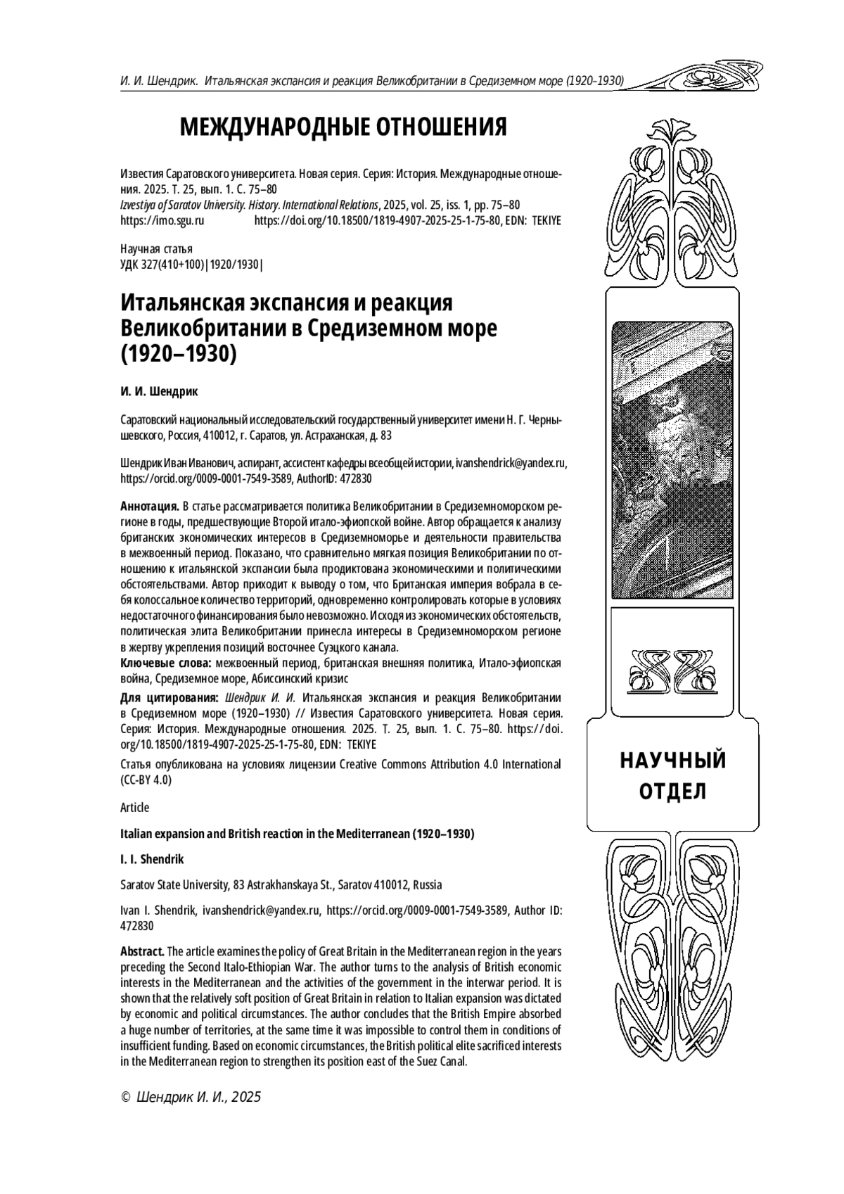 В статье рассматривается политика Великобритании в Средиземноморском регионе в годы, предшествующие Второй итало-эфиопской войне. Автор обращается к анализу британских экономических интересов в Средиземноморье и деятельности правительства в межвоенный период. Показано, что сравнительно мягкая позиция Великобритании по отношению к итальянской экспансии была продиктована экономическими и политическими обстоятельствами. Автор приходит к выводу о том, что Британская империя вобрала в себя колоссальное количество территорий, одновременно контролировать которые в условиях недостаточного финансирования было невозможно. Исходя из экономических обстоятельств, политическая элита Великобритании принесла интересы в Средиземноморском регионе в жертву укрепления позиций восточнее Суэцкого канала.