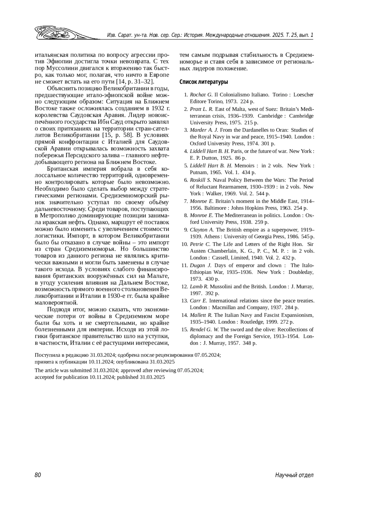 2. 	Pratt L. R. East of Malta, west of Suez: Britain’s Mediterranean crisis, 1936-1939. Cambridge: Cambridge University Press, 1975. 215 p.