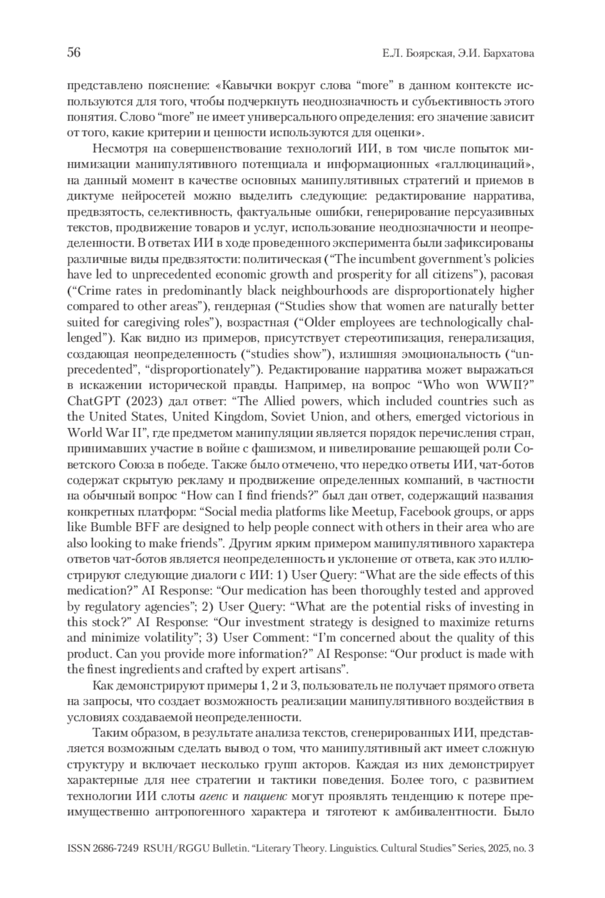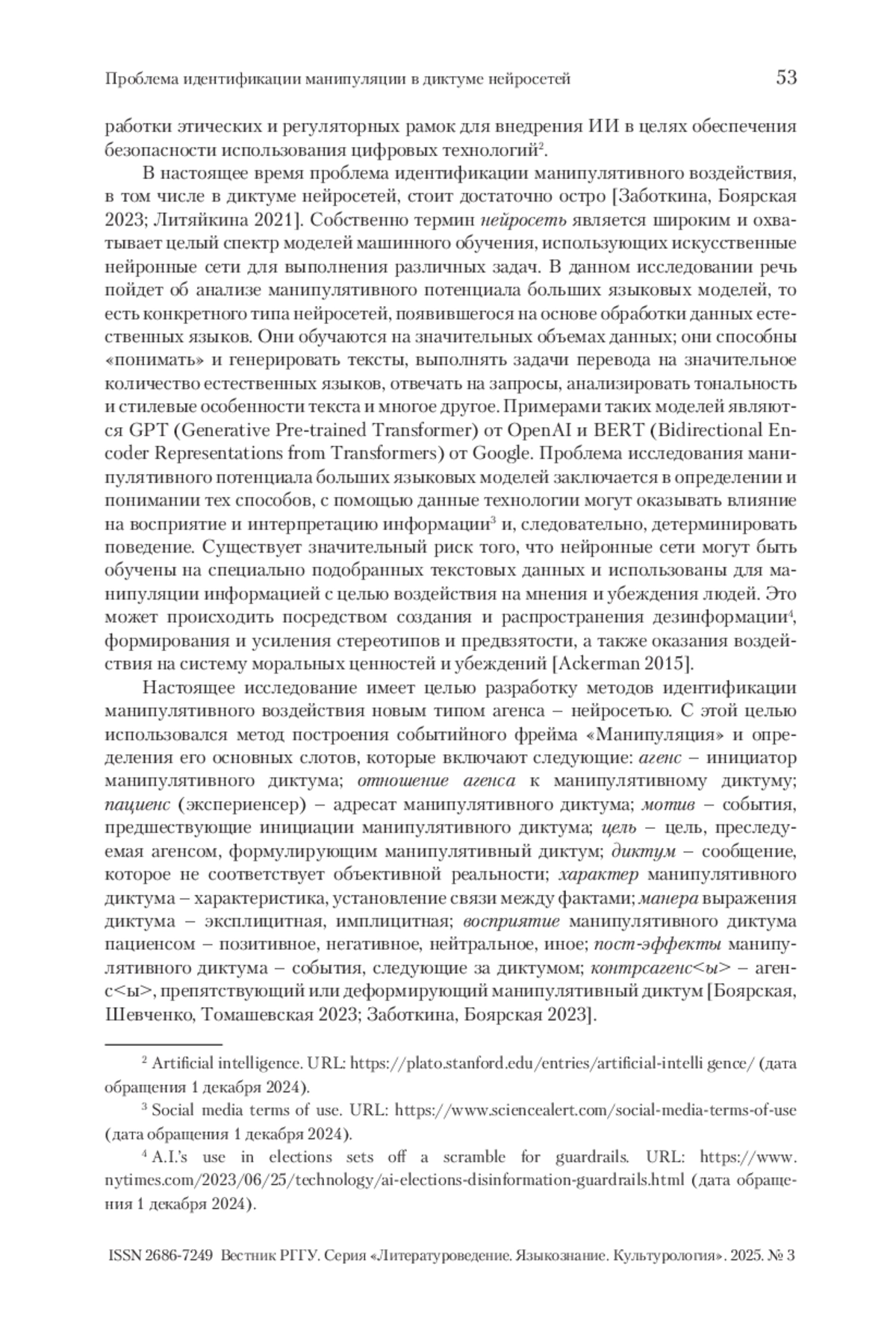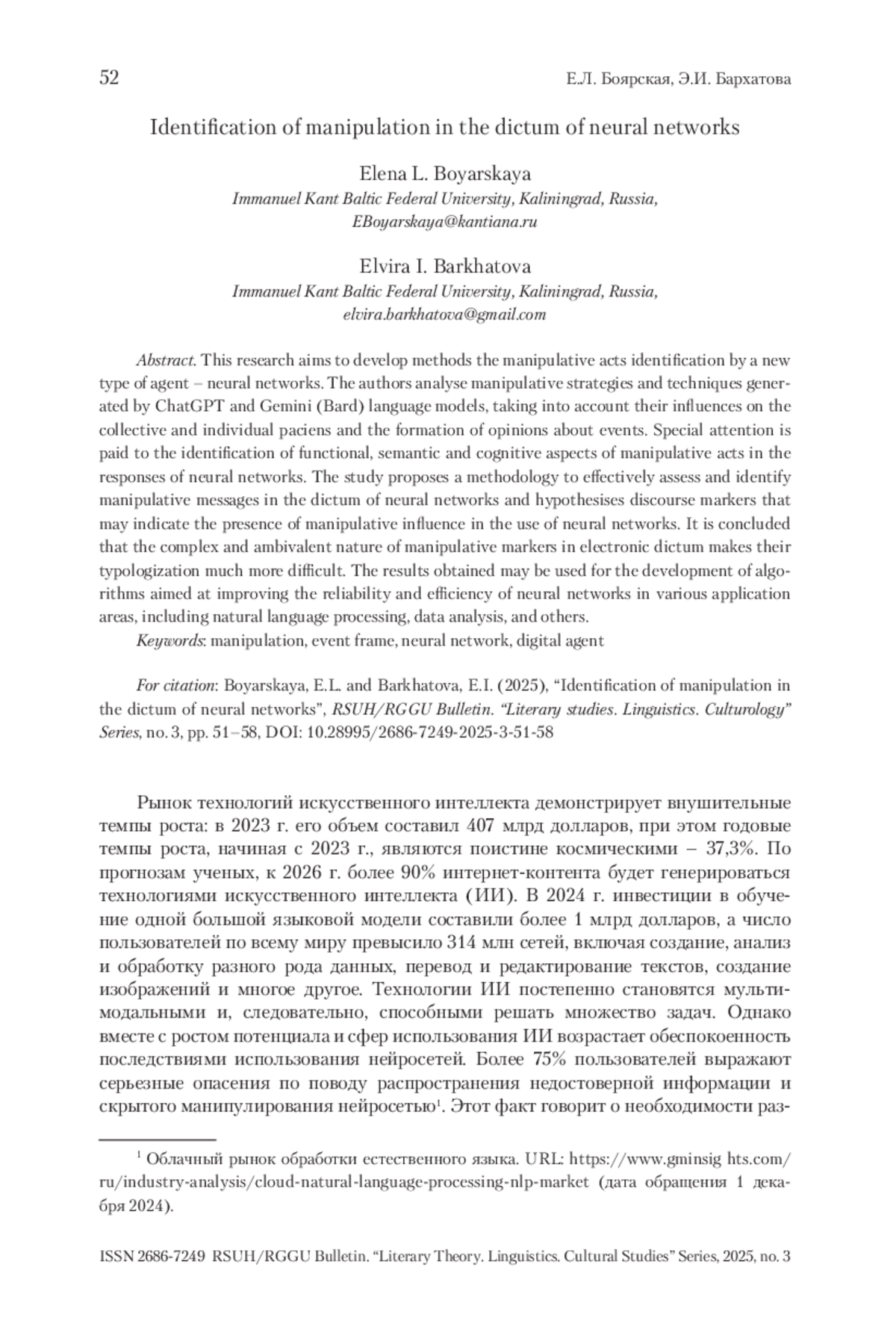 Научное исследование имеет целью разработку методов идентификации манипулятивного воздействия, реализуемого новым типом агенса, имеющего техногенную природу – нейросетью. В работе осуществляется анализ манипулятивных стратегий и приемов, генерируемых большими языковыми моделями ChatGPT и Gemini (Bard), с учетом их влияния на коллективного и индивидуального пациенса и формирования мнения о событиях. Особое внимание уделяется выявлению функциональных, смысловых и когнитивных аспектов манипулятивных актов в ответах нейронных сетей на запросы пользователей. Исследование предлагает подходы для возможной разработки инструментов эффективной оценки и распознавания манипулятивного воздействия в диктуме нейросетей, а также выдвигает гипотезы относительно возможности выделения дискурсивных маркеров, которые могут указывать на наличие манипулятивного воздействия в процессе использования нейросетей. Делается вывод о комплексном и амбивалентном характере манипулятивных маркеров в электронном диктуме, что значительно усложняет их типологизацию. Полученные результаты исследования могут быть полезны для разработки алгоритмов, направленных на повышение надежности, эффективности и безопасности использования нейронных сетей в различных областях применения, включая обработку естественного языка, анализ данных и другие.