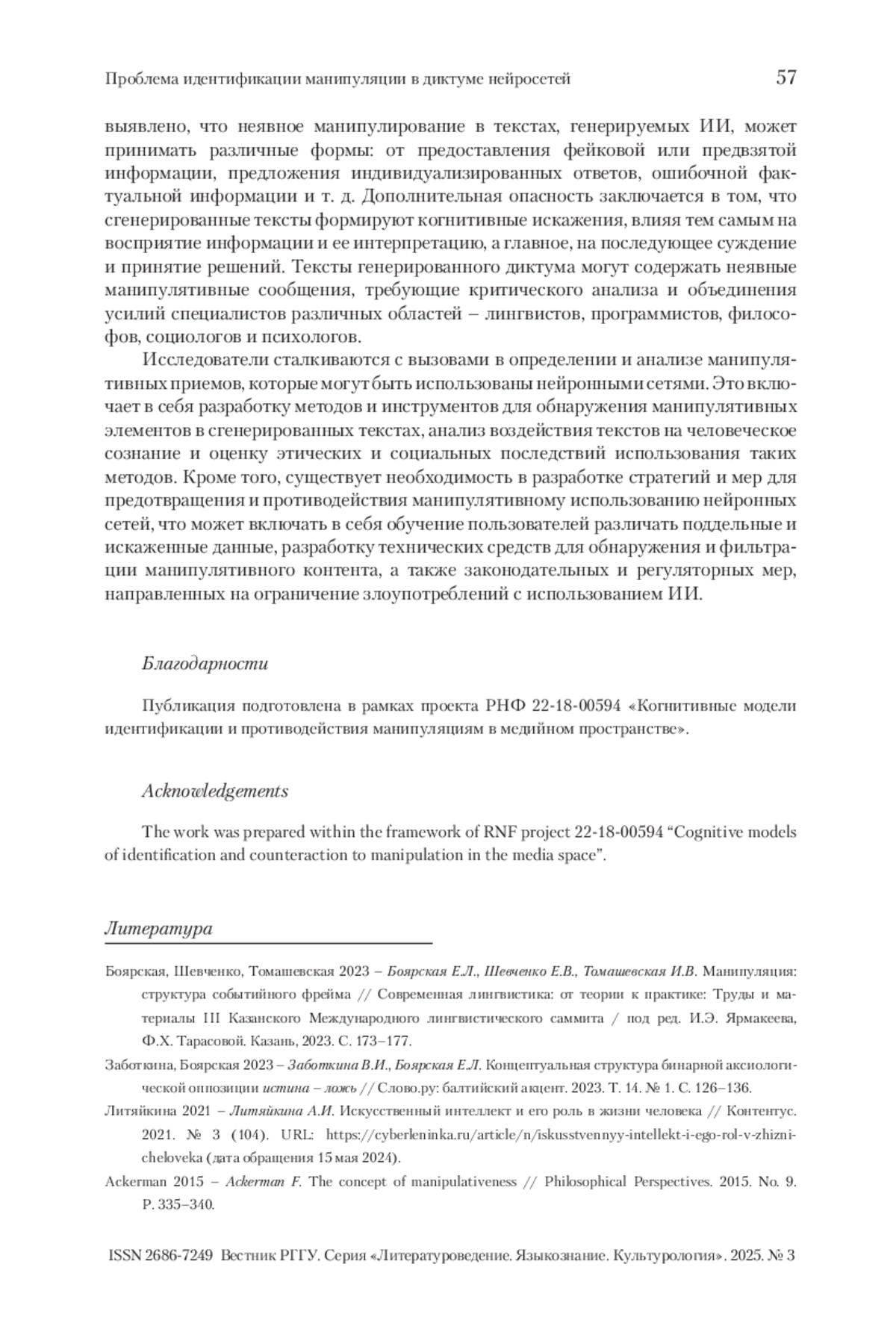 1. Боярская, Шевченко, Томашевская 2023 - Боярская Е.Л., Шевченко Е.В., Томашевская И.В. Манипуляция: структура событийного фрейма // Современная лингвистика: от теории к практике: Труды и материалы III Казанского Международного лингвистического саммита / под ред. И.Э. Ярмакеева, Ф.Х. Тарасовой. Казань, 2023. С. 173-177.