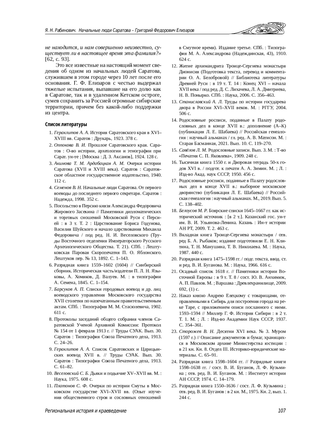 27. Рабинович Я. Н. История первоначального Саратова 1590-1604 годов: характеристика источников и хронология событий (до начала Смутного времени) // Известия Саратовского университета. Новая серия. Серия: История. Международные отношения. 2016. Т. 16, вып. 1. С. 80-87. DOI: 10.18500/1819-4907-2016-16-1-80-87 EDN: VUTTAP