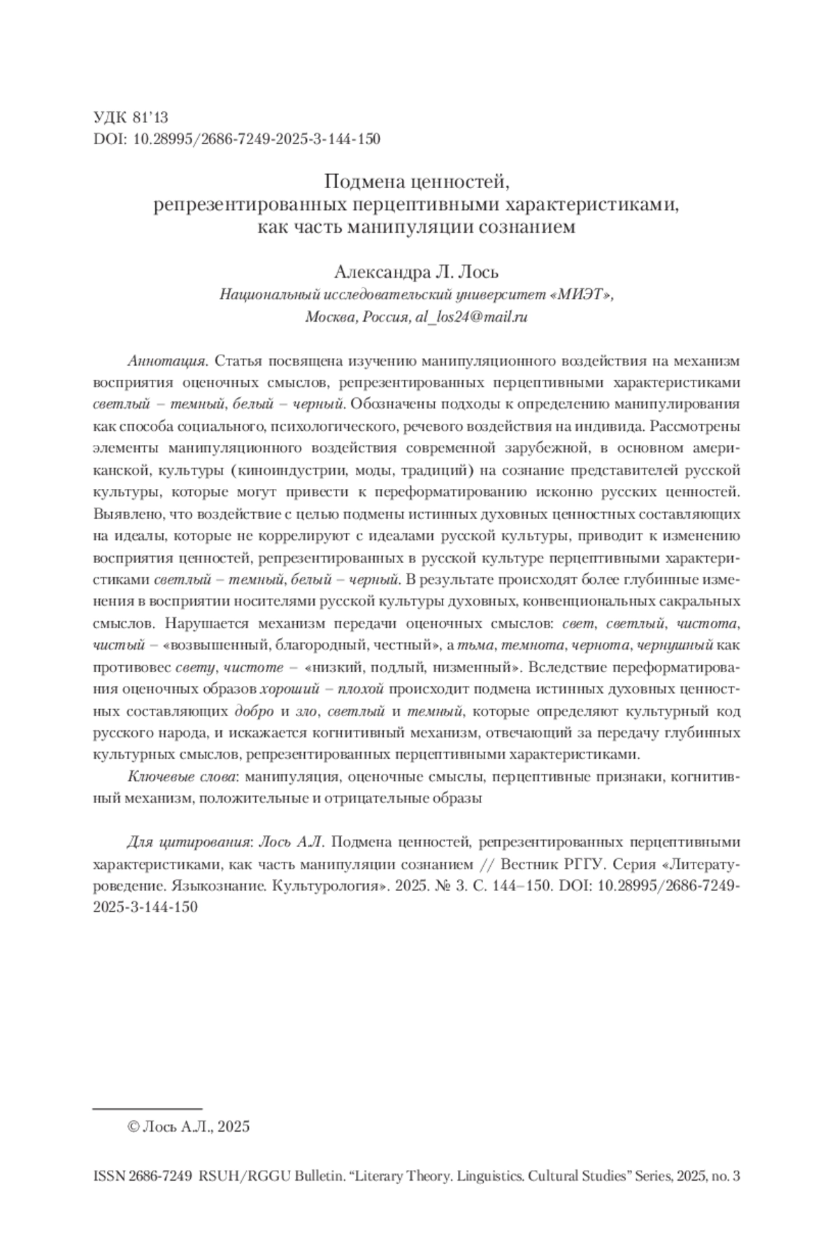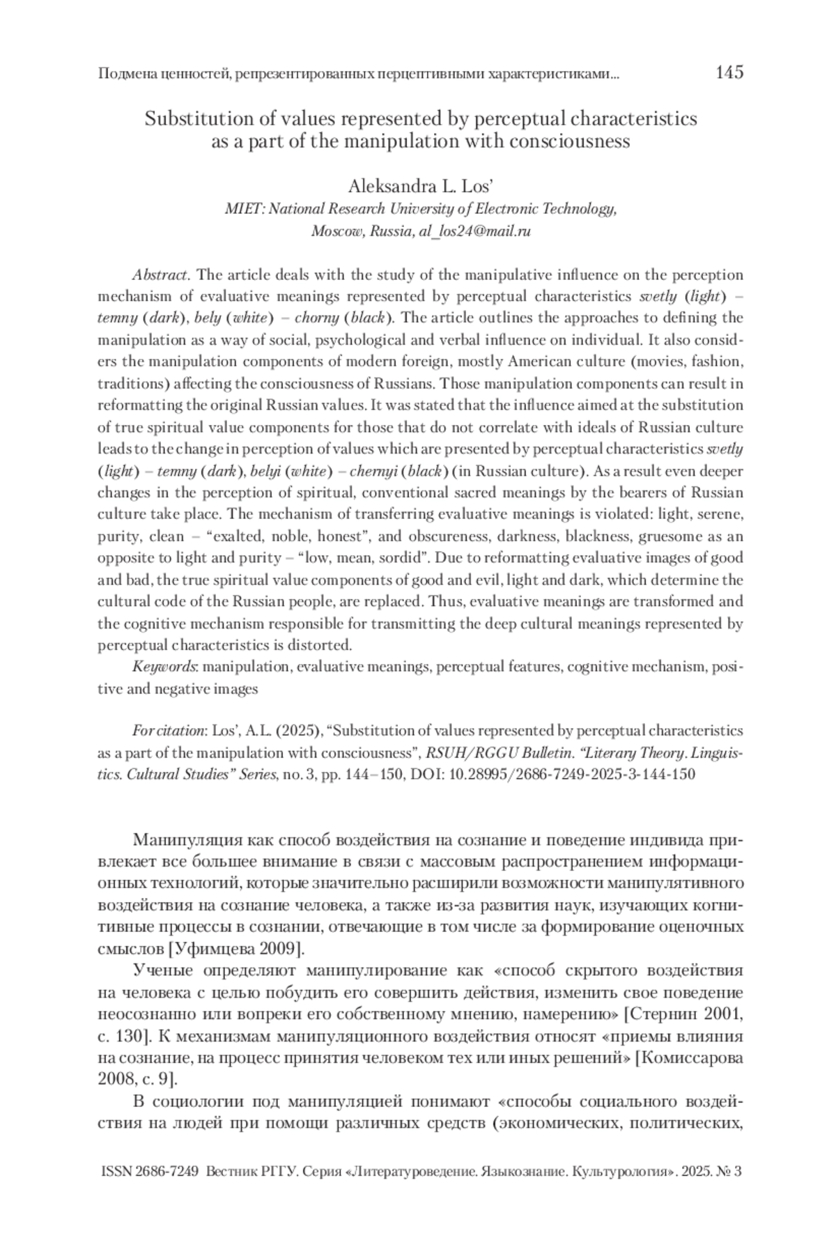 Статья посвящена изучению манипуляционного воздействия на механизм восприятия оценочных смыслов, репрезентированных перцептивными характеристиками светлый – темный, белый – черный. Обозначены подходы к определению манипулирования как способа социального, психологического, речевого воздействия на индивида. Рассмотрены элементы манипуляционного воздействия современной зарубежной, в основном американской, культуры (киноиндустрии, моды, традиций) на сознание представителей русской культуры, которые могут привести к переформатированию исконно русских ценностей. Выявлено, что воздействие с целью подмены истинных духовных ценностных составляющих на идеалы, которые не коррелируют с идеалами русской культуры, приводит к изменению восприятия ценностей, репрезентированных в русской культуре перцептивными характеристиками светлый – темный, белый – черный. В результате происходят более глубинные изменения в восприятии носителями русской культуры духовных, конвенциональных сакральных смыслов. Нарушается механизм передачи оценочных смыслов: свет, светлый, чистота, чистый – «возвышенный, благородный, честный», а тьма, темнота, чернота, чернушный как противовес свету, чистоте – «низкий, подлый, низменный». Вследствие переформатирования оценочных образов хороший – плохой происходит подмена истинных духовных ценностных составляющих добро и зло, светлый и темный, которые определяют культурный код русского народа, и искажается когнитивный механизм, отвечающий за передачу глубинных культурных смыслов, репрезентированных перцептивными характеристиками.