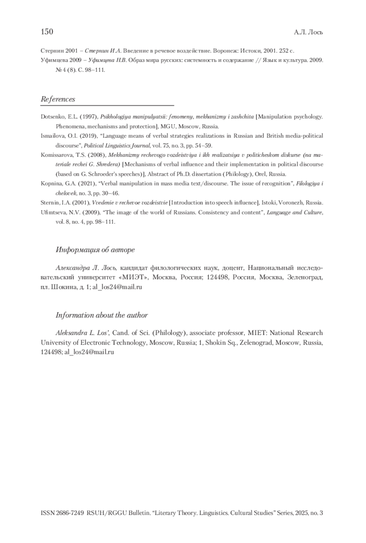 4. Копнина 2021 - Копнина Г.А. Речевая манипуляция в массмедийном тексте/дискурсе: проблема распознавания // Филология и человек. 2021. № 3. С. 30-46.