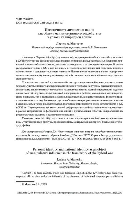 Социолингвистический и когнитивный конструкт национальной принадлежности на материале мультимедийного дискурса на английском и тем более на русском языках подвергается жесткому давлению и противостоянию на основе намеренно ложной информации, подмены одних понятий другими, полуправдивой информации и фейков, касающихся как исторического прошлого, так и настоящих событий, представленных в коммуникации. В работе представлены элементы подобного конструкта и обозначены приоритетные позиции сочетаемости в двух языках, а также комментируется диаграмма встречаемости слова идентичность в ХХ и ХХI вв. Формирование «асимметричной референциональной соотнесенности» происходит в рамках гибридности информационной войны и происходящих событий, направленных на русскоязычную культуру и человеческое сознание.