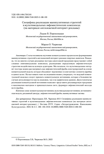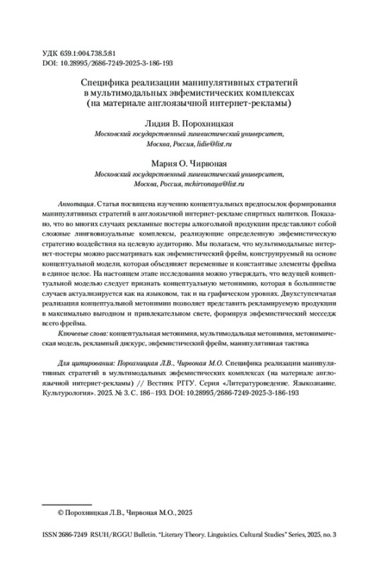 Статья посвящена изучению концептуальных предпосылок формирования манипулятивных стратегий в англоязычной интернет-рекламе спиртных напитков. Показано, что во многих случаях рекламные постеры алкогольной продукции представляют собой сложные лингвовизуальные комплексы, реализующие определенную эвфемистическую стратегию воздействия на целевую аудиторию. Мы полагаем, что мультимодальные интернет-постеры можно рассматривать как эвфемистический фрейм, конструируемый на основе концептуальной модели, которая объединяет переменные и константные элементы фрейма в единое целое. На настоящем этапе исследования можно утверждать, что ведущей концептуальной моделью следует признать концептуальную метонимию, которая в большинстве случаев актуализируется как на языковом, так и на графическом уровнях. Двухступенчатая реализация концептуальной метонимии позволяет представить рекламируемую продукции в максимально выгодном и привлекательном свете, формируя эвфемистический месседж всего фрейма.