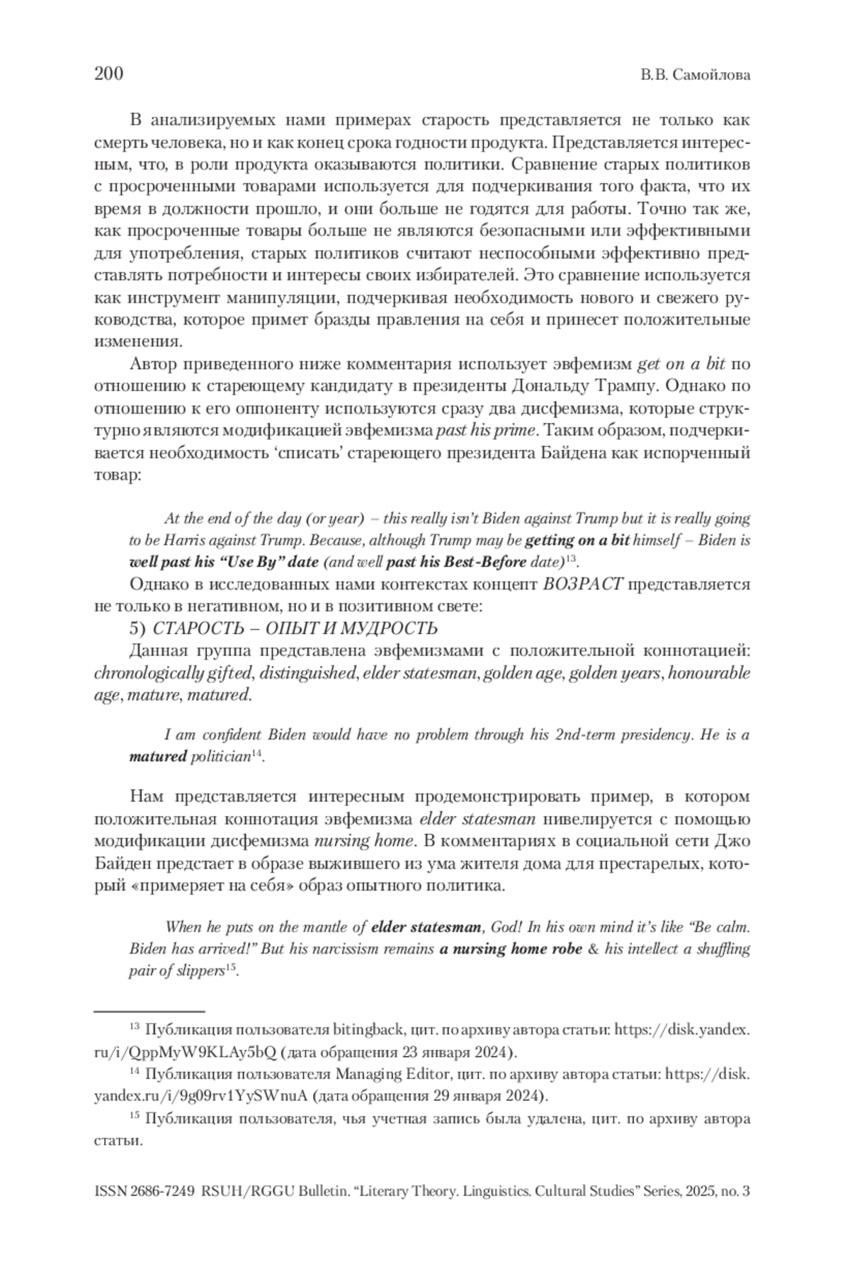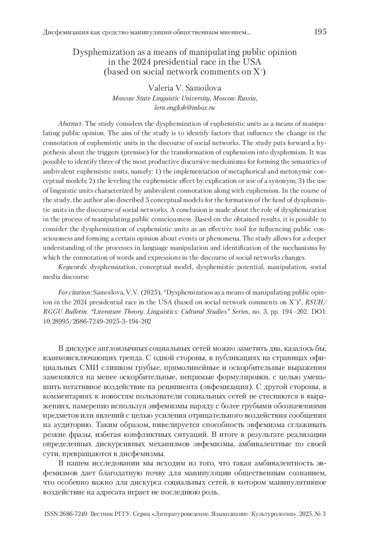 Данное исследование рассматривает дисфемизацию эвфемистических единиц как средство манипулирования общественным сознанием. Целью исследования является выявление факторов, влияющих на изменение коннотации эвфемистических единиц в дискурсе социальных сетей. В ходе исследования выдвинута гипотеза о триггерах (предпосылках) превращения эвфемизма в дисфемизм. Удалось выделить три самых продуктивных дискурсивных механизма формирования семантики амбивалентных эвфемистических единиц, а именно: 1) реализацию метафорических и метонимических концептуальных моделей; 2) нивелирование эвфемистического эффекта путем экспликации или использования синонима; 3) использование языковых единиц, характеризующихся амбивалентной коннотацией наряду с эвфемизмом. В процессе исследования были также описаны пять концептуальных моделей формирования фонда дисфемистических единиц в дискурсе социальных сетей. Сделан вывод о роли дисфемизации в процессе манипуляции общественным сознанием. На основе полученных результатов можно рассматривать дисфемизацию эвфемистических единиц как эффективный инструмент воздействия на общественное сознание и формирования определенного мнения о событиях или явлениях. Данное исследование позволяет более глубоко понять процессы манипуляции языком и выявить механизмы, с помощью которых происходит изменение коннотации слов и выражений в дискурсе социальных сетей.