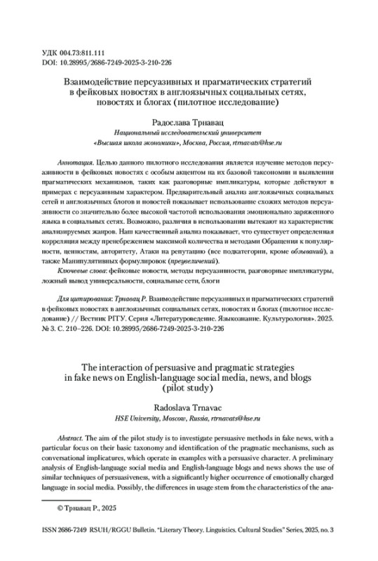 14. Trnavac, Poldvere 2024 - Trnavac R., Poldvere N. Investigating appraisal and the language of evaluation in fake news corpora // Corpus Pragmatics. 2024. Vol. 8. No. 2. P. 107-130.