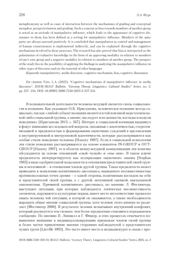 В статье рассматривается манипулятивное воздействие на сознание человека в медиадискурсе на примере либерального новостного издания. Выявление когнитивных механизмов, активизируемых в этой области, позволило раскрыть комплексную природу манипулятивного воздействия. Установлены механизмы спецификации, противопоставления, градуирования, концептуальной метонимии, метафоры и метафтонимии, а также случаи взаимодействия механизмов градуирования и концептуальной метафоры, перспективизации и градуирования. В качестве установки манипулятивного воздействия отмечено такое понятие, как предвзятость по отношению к представителям другой группы, что приводит к появлению у них когнитивного диссонанса. Однопартийцы же оцениваются всегда позитивно. Сделан вывод о том, что манипуляция как контроль и управление сознанием человека реализуется косвенно и может быть разъяснена за счет задействованных в этих процессах когнитивных механизмов. Установлено также, что предвзятость интерпретируется как поляризация оценочного знания в виде одобрительной модальности в отношении представителей своей группы и негативной – в отношении членов другой группы. Перспектива данного исследования заключается в возможности применения полученных результатов в анализе манипулятивного воздействия в других типах дискурса и на материале других языков.