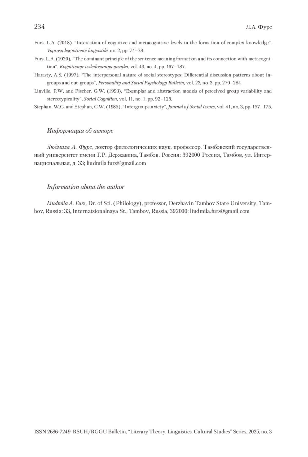 3. Фурс 2018 - Фурс Л.А. Взаимодействие когнитивного и метакогнитивного уровней в формировании комплексного знания // Вопросы когнитивной лингвистики. 2018. № 2. С. 74-78.