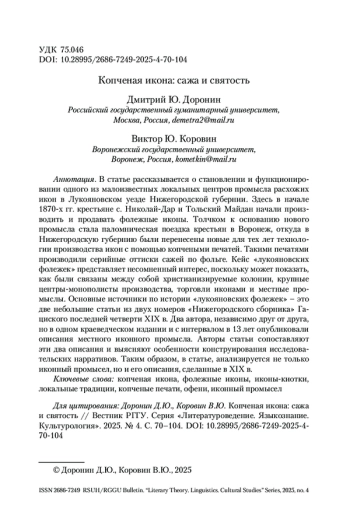 15. Доронин 2024с - Доронин Д.Ю. Сияющие святыни: промысел расхожей иконы и его аффордансы в XIX-XX вв. // Государство, религия, церковь в России и за рубежом. 2024. № 3. С. 100-135.