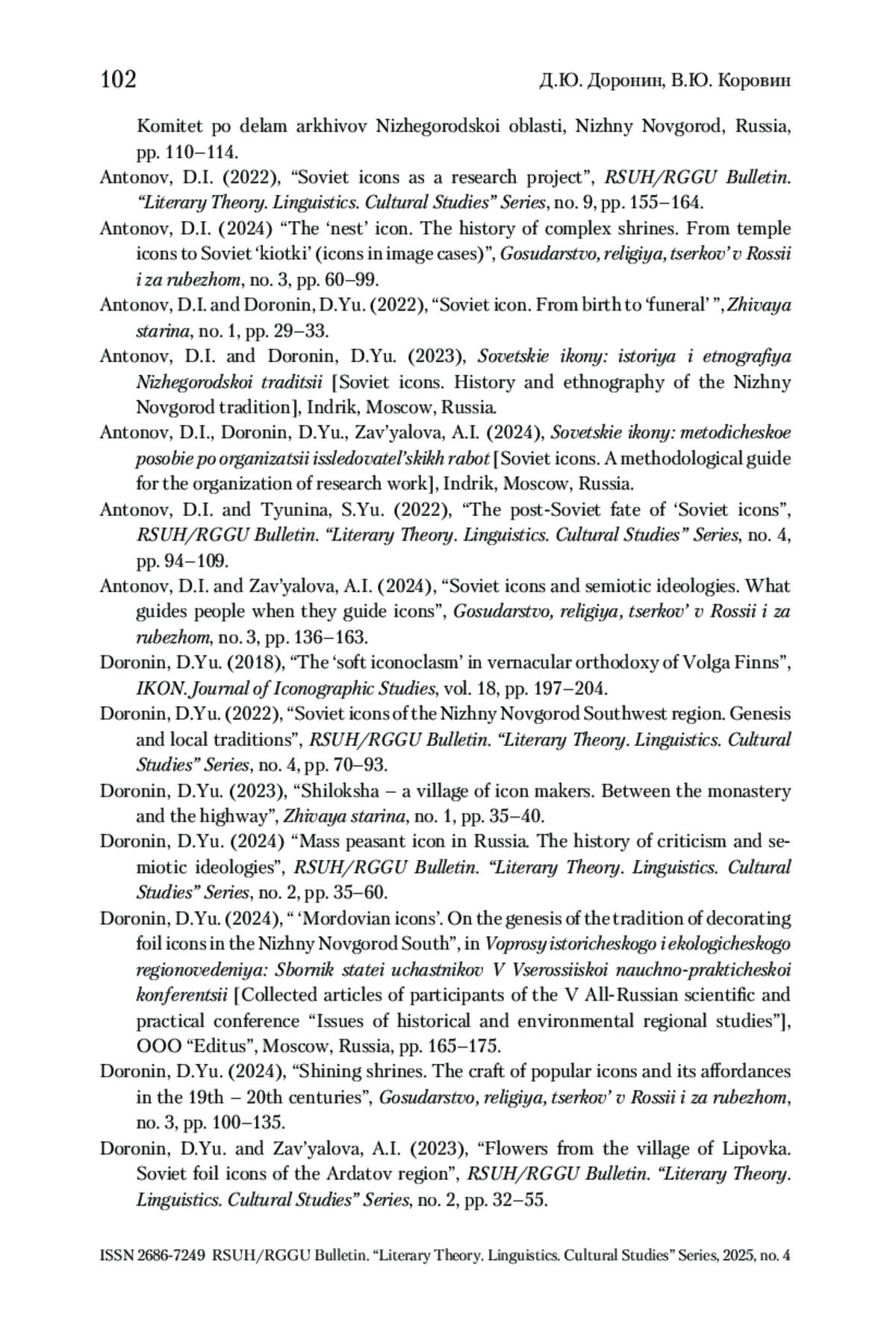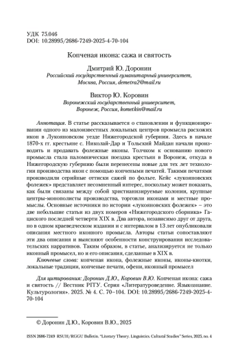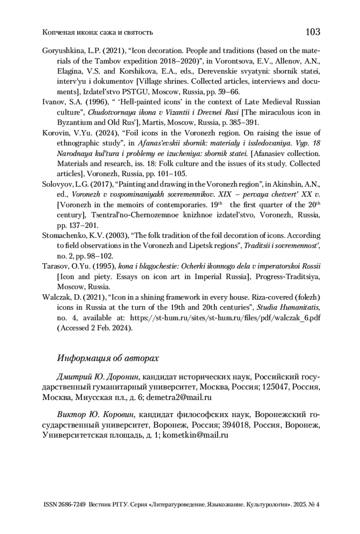 13. Доронин 2024a - Доронин Д.Ю. Массовая крестьянская икона в России: история критики и семиотические идеологии // Вестник РГГУ. Серия «Литературоведение. Языкознание. Культурология». 2024. № 2. С. 35-60.