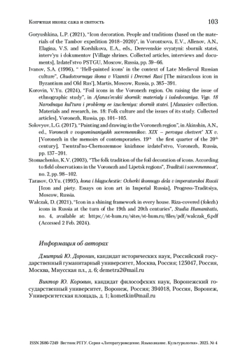 19. Коровин 2024 - Коровин В.Ю. Фолежные иконы в Воронежском крае: к постановке вопроса этнографического изучения // Афанасьевский сборник: Vатериалы и исследования. Вып. 18: Народная культура и проблемы ее изучения: Сборник статей. Воронеж, 2024. С. 101-105.