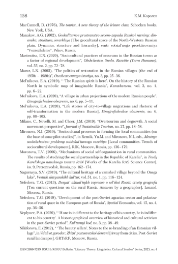 1. Аверкиева 2020 - Аверкиева К.В. Участие горожан в развитии сельской местности: Гостевые дома на Русском Севере // Вестник Московского университета. Серия 5. География. 2020. № 2. С. 66-72.