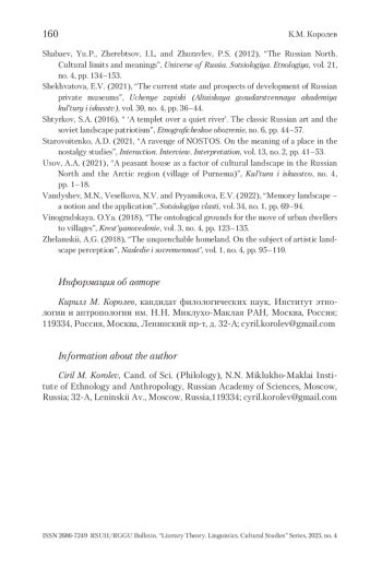 46. Старовойтенко 2021 - Старовойтенко А.Д. Месть NOSTOS: о значении места в исследованиях ностальгии // Интеракция. Интервью. Интерпретация. 2021. Т. 13. № 2. С. 41-53.