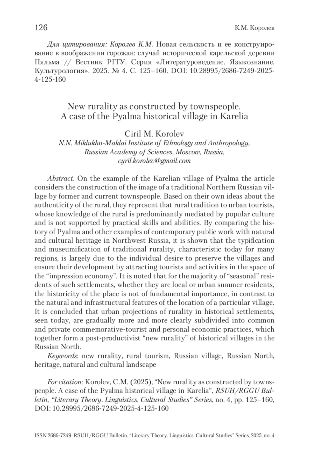 На примере карельской деревни Пяльма, расположенной в Поонежье, в статье рассматривается конструирование образа традиционной севернорусской деревни бывшими и нынешними горожанами, которые, опираясь на собственные представления об аутентичности сельского, репрезентируют эту сельскую традицию для туристов-горожан, чьи знания о сельском преимущественно опосредованы массовой культурой и не подкреплены практическими умениями и навыками. Через сопоставление истории Пяльмы с другими примерами современной общественной работы с природно-культурным наследием на Северо-Западе России показывается, что типизация и музеефикация традиционной сельскости, характерная сегодня для многих регионов, в немалой степени обуславливается индивидуальными попытками сохранить деревни и обеспечить их развитие за счет привлечения туристов и деятельности в пространстве «экономики впечатлений». Отмечается, что для большинства «сезонных» жителей таких поселений, будь они местными или горожанами-дачниками, историчность места не имеет принципиального значения, в отличие от природных и инфраструктурных особенностей местоположения конкретной деревни. Делается вывод, что городские проекции сельскости в исторических поселениях, наблюдаемые в наши дни, постепенно все отчетливее подразделяются на общие и частные коммеморативно-туристические и личные хозяйственные практики, которые вместе образуют постпродуктивистскую «новую сельскость» исторических деревень Русского Севера.