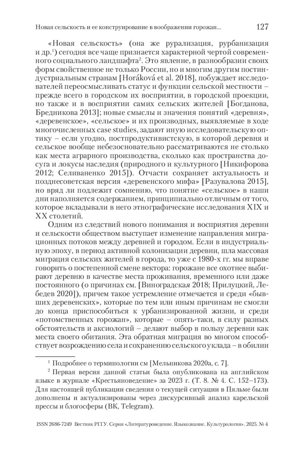 26. Мельникова 2020a - Мельникова Е.А. Деревня в городских проекциях современных россиян // Этнографическое обозрение. 2020. № 6. С. 5-11.