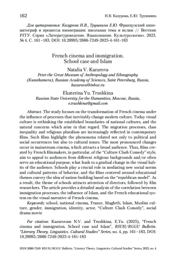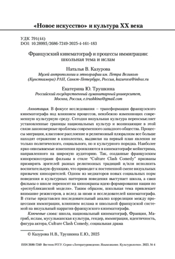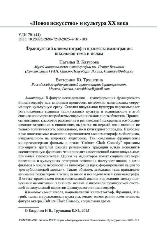 В фокусе исследования – трансформация французского кинематографа под влиянием процессов, неизбежно изменяющих современную культурную среду. Сегодня визуальная культура переосмысляет установленные границы национальных культур и возникающие в этой связи закономерные проблемы современного западного общества. Процессы миграции, классовое расслоение и религиозный плюрализм все больше находят отражение в кинолентах, выдвигая на первый план явления не только политического, социального, но и культурного порядка. Наиболее ярко описываемые изменения проявляются в кинематографе мейнстрима, направленного на широкую аудиторию. Так, созданные французским кинорежиссерами фильмы в стиле “Culture Clash Comedy” призваны примирить зрителей разных религиозных традиций и/или исполнить воспитательную функцию, что приводит к постепенной смене визуальных привычек кинозрителей. Одним из медиаторов новых социальных норм поведения и культурных паттернов поведения выступает школа, а сами фильмы о школе переносят на киноэкраны идею формирования нации по «республиканской модели». Таким образом, школьная тема привлекает внимание режиссеров, а вслед за ними и исследователей кинематографа. В статье представлен последовательный анализ корреляции между процессами иммиграции, влиянием ислама и школьной французской системой на визуальный нарратив французского кинематографа.
