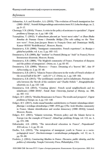 1. Ашмарина, Корнилов 2019 - Ашмарина А.А., Корнилов А.А. Эволюция французского законодательства в сфере иммиграции (2003-2016 гг.) // Вестник Нижегородского университета им. Н.И. Лобачевского. 2019. № 2. С. 9-17.