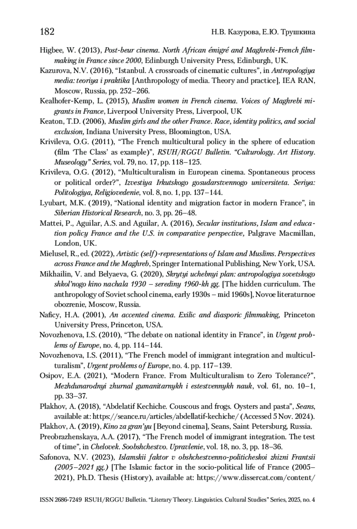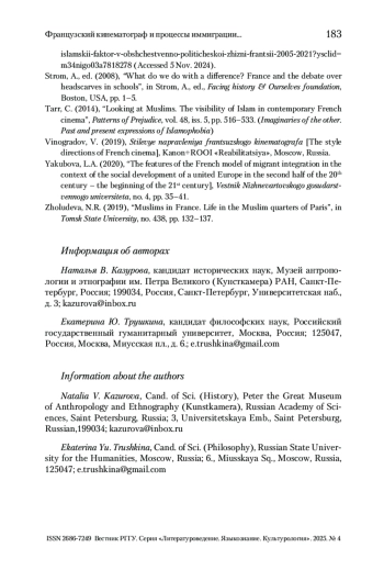 17. Кривилева 2011 - Кривилева О.Г. Французская мультикультурная политика в сфере образования (на примере кинофильма «Класс») // Вестник РГГУ. Серия: История. Филология. Культурология. Востоковедение. 2011. № 17 (79). С. 118-125.