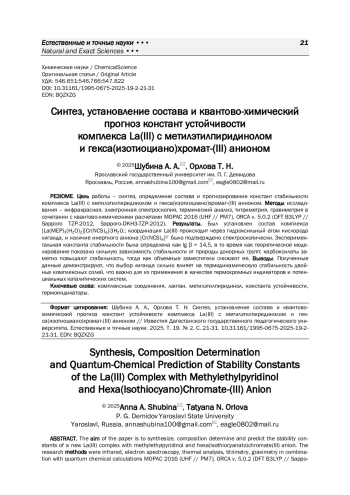 Цель работы - синтез, определение состава и прогнозирование констант стабильности комплекса La(III) с метилэтилпиридинолом и гекса(изотиоциано)хромат-(III) анионом. Методы исследования - инфракрасная, электронная спектроскопия, термический анализ, титриметрия, гравиметрия в сочетании с квантово-химическими расчетами MOPAC 2016 (UHF // PM7), ORCA v. 5.0.2 (DFT B3LYP // Sapporo TZP-2012, Sapporo-DKH3-TZP-2012). Результаты. Был установлен состав комплекса [La(MEP)₃(H₂O)₂][Cr(NCS)₆]·3H₂O.; координация La(III) происходит через гидроксильный атом кислорода лиганда, и наличие инертного аниона [Cr(NCS)₆]3⁻ было подтверждено спектроскопически. Экспериментальная константа стабильности была определена как lg β = 14,5, в то время как теоретическое моделирование показало сильную зависимость стабильности от природы донорных групп: карбоксилаты заметно повышают стабильность, тогда как объемные заместители снижают ее. Выводы. Полученные данные демонстрируют, что выбор лиганда сильно влияет на термодинамическую стабильность двойных комплексных солей, что важно для их применения в качестве термохромных индикаторов и потенциальных каталитических систем.