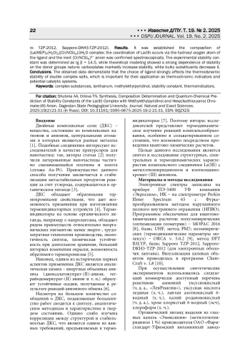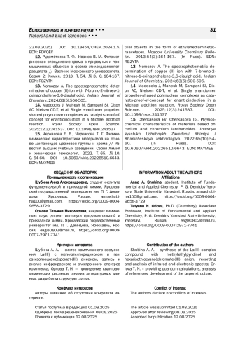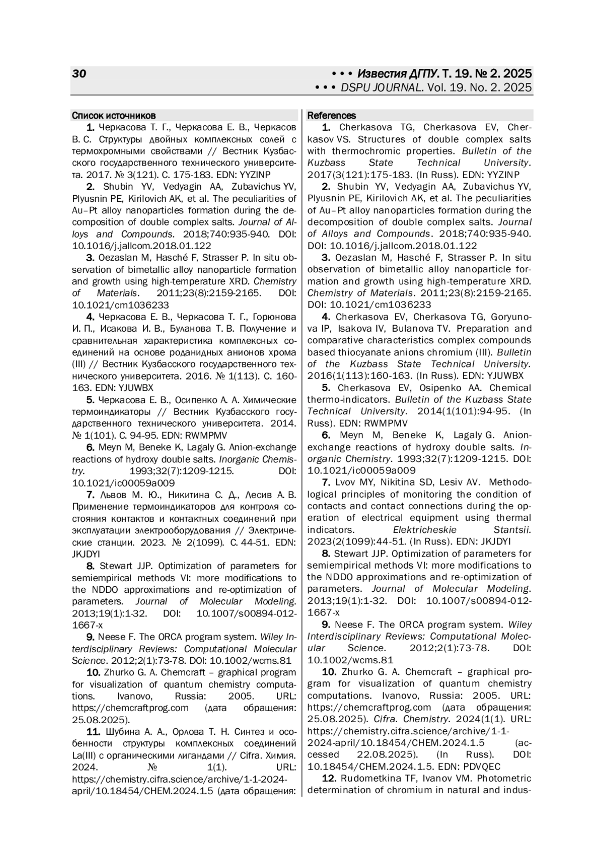 11. 	Шубина А. А., Орлова Т. Н. Синтез и особенности структуры комплексных соединений La(III) с органическими лигандами // Cifra. Химия. 2024. № 1(1). URL: https://chemistry.cifra.science/archive/1-1-2024-april/10.18454/CHEM.2024.1.5 (дата обращения: 22.08.2025). DOI: 10.18454/CHEM.2024.1.5.