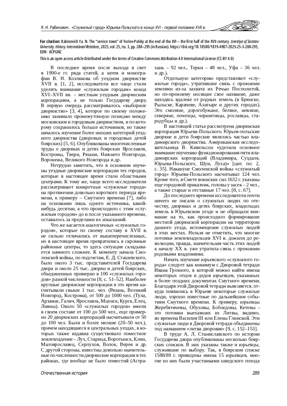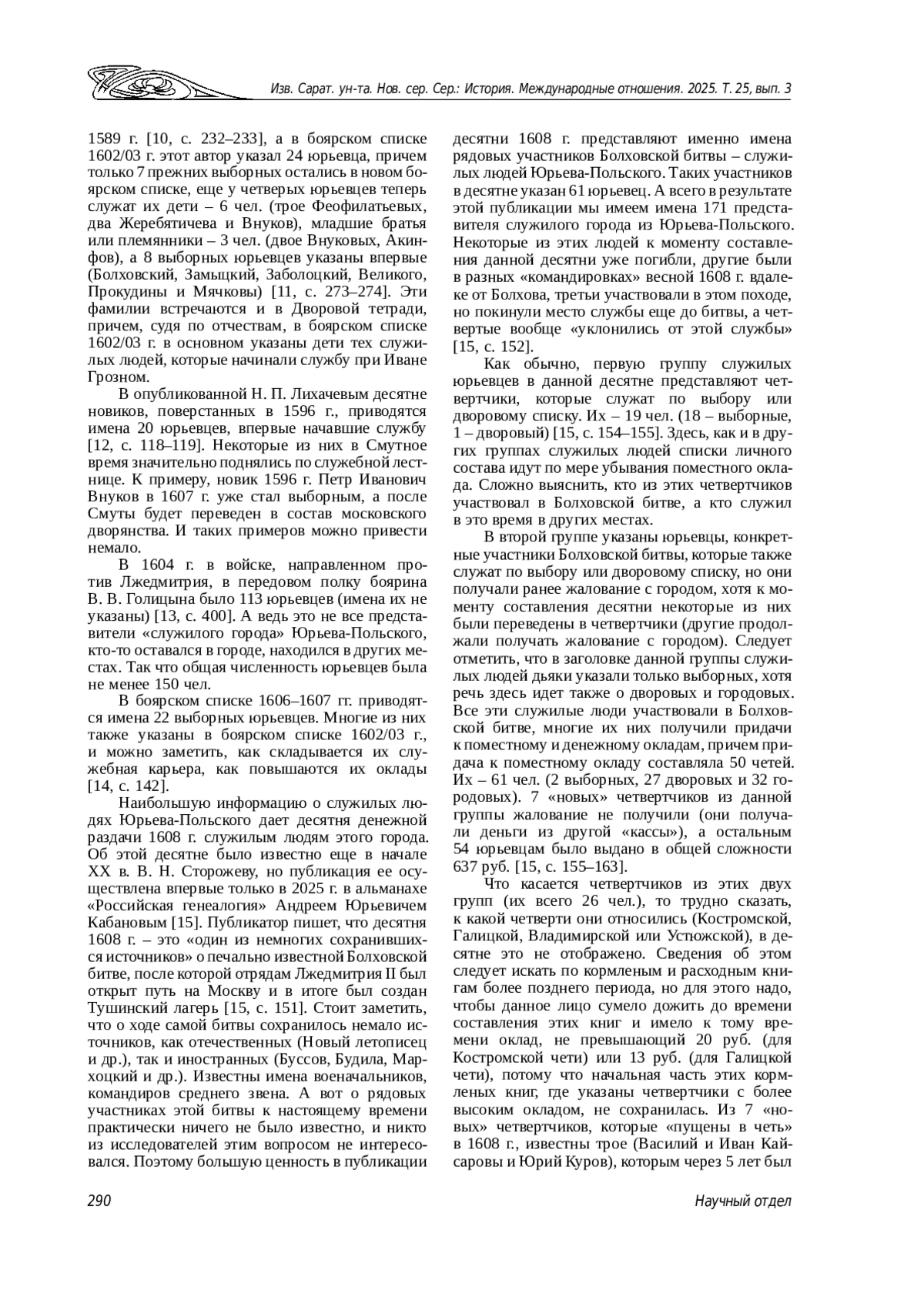 В статье впервые рассмотрена дворянская корпорация Юрьева-Польского (так называемый «служилый город») на протяжении почти целого века. Основным источником стала десятня 1608 г., благодаря которой удалось установить, кто из юрьевцев принимал участие в Болховской битве 30 апреля – 1 мая 1608 г. Выяснено, в каких событиях XVI–XVII вв. участвовали служилые люди, указанные в данной десятне, а также их предки и потомки, какие они получали награды за службу и как происходил рост их служебной карьеры. Обнаружено, что значительная часть юрьевских землевладельцев ведут свой род от знатных новгородцев, испомещенных в Юрьевском уезде в конце XV в. по приказу Великого князя Ивана III, а также от «литвы дворовой».
