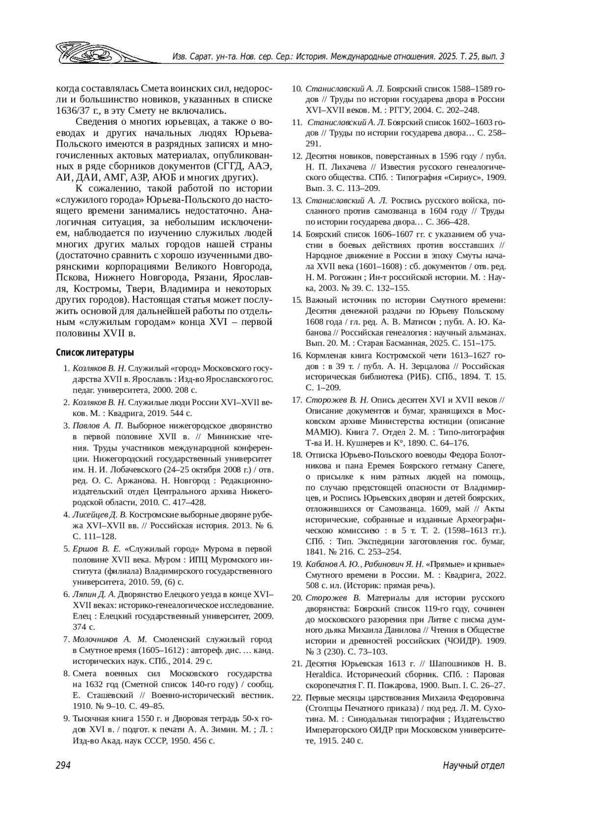 1. 	Козляков В. Н. Служилый “город” Московского государства XVII в. Ярославль: Изд-во Ярославского гос. педаг. университета, 2000. 208 с. EDN: UXZEFH